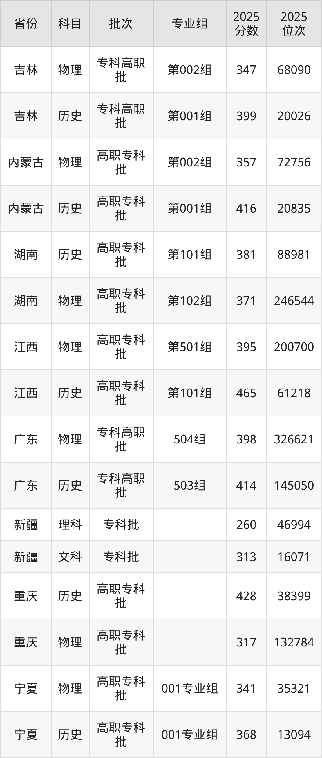 普通类专科物理类最低347分,专科历史类最低399分