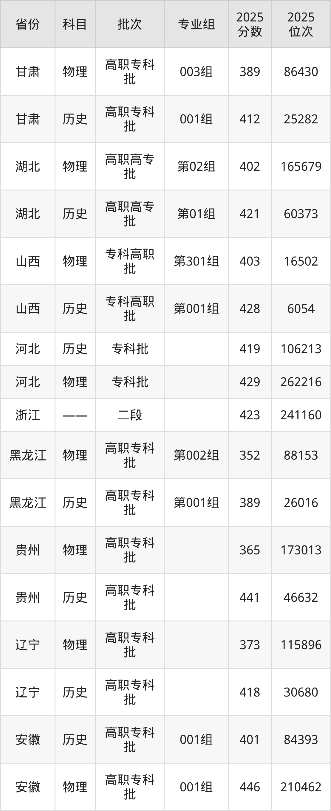 普通类专科物理类最低446分,专科历史类最低401分