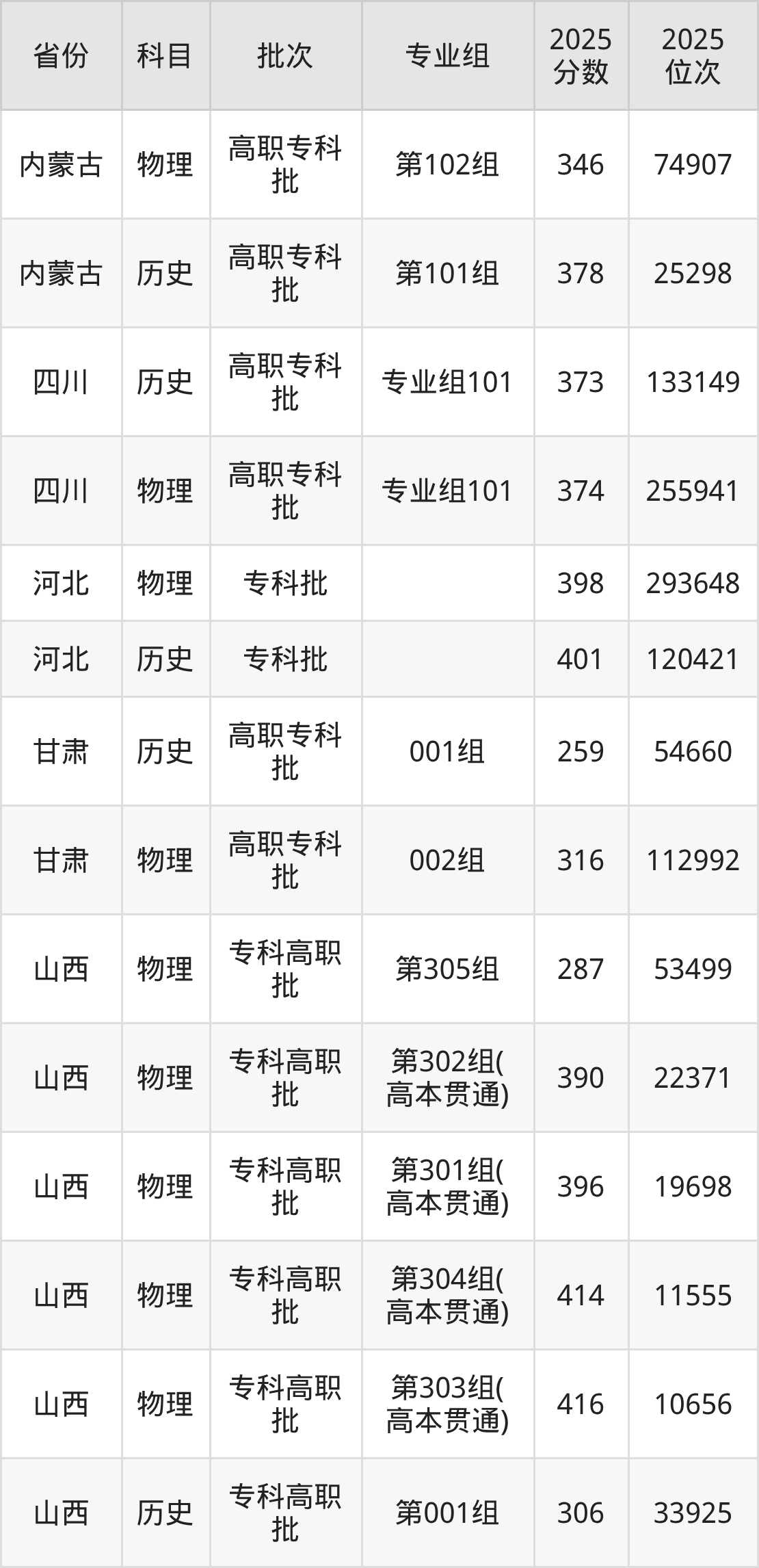 2025年太原城市职业技术学院全国录取分数线是259分到416分,录取最低在甘肃历史类(001组)、录取最高在山西物理类(第303组(高本贯通))。各省各专业组最低分具有差异,详情如下: