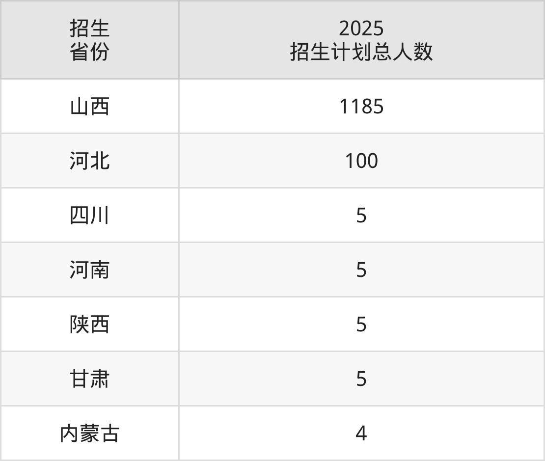 2025年太原城市职业技术学院面向全国7个省市开展专科招生;招生专业共34个,招生人数共1309人。2025年在山西省招生计划总人数是1185人,其中,太原城市职业技术学院在山西省招生人数最多的是机电一体化技术。太原城市职业技术学院在各省具体招生人数情况如下表。