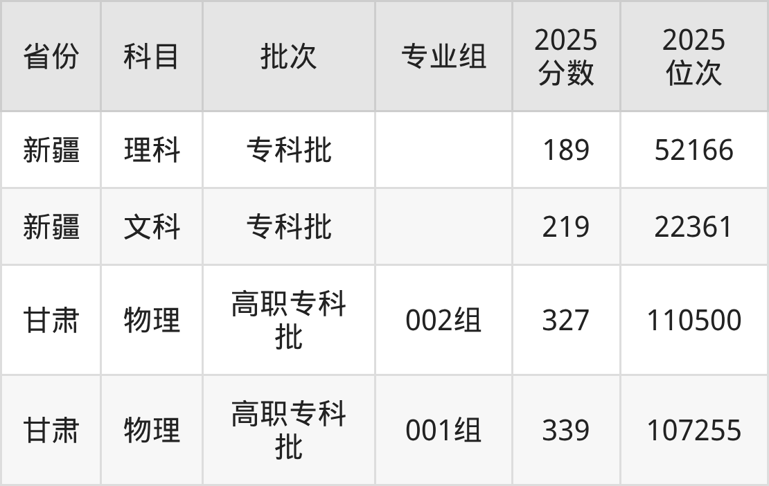 2025年新疆工业职业技术学院全国录取分数线是189分到339分,录取最低在新疆理科、录取最高在甘肃物理类(001组)。各省各专业组最低分具有差异,详情如下: