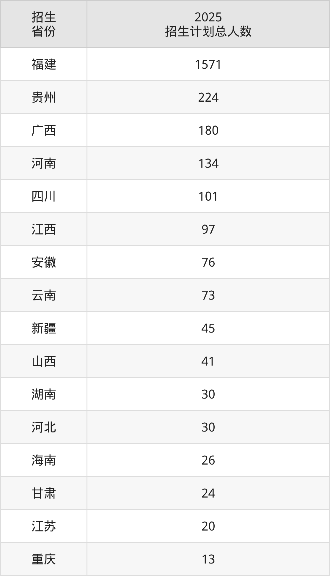 2025年莆田学院面向全国17个省市开展本科招生;招生专业共40个,招生人数共2690人。2025年在福建省招生计划总人数是1571人,其中,莆田学院在福建省招生人数最多的是护理学。莆田学院在各省具体招生人数情况如下表。