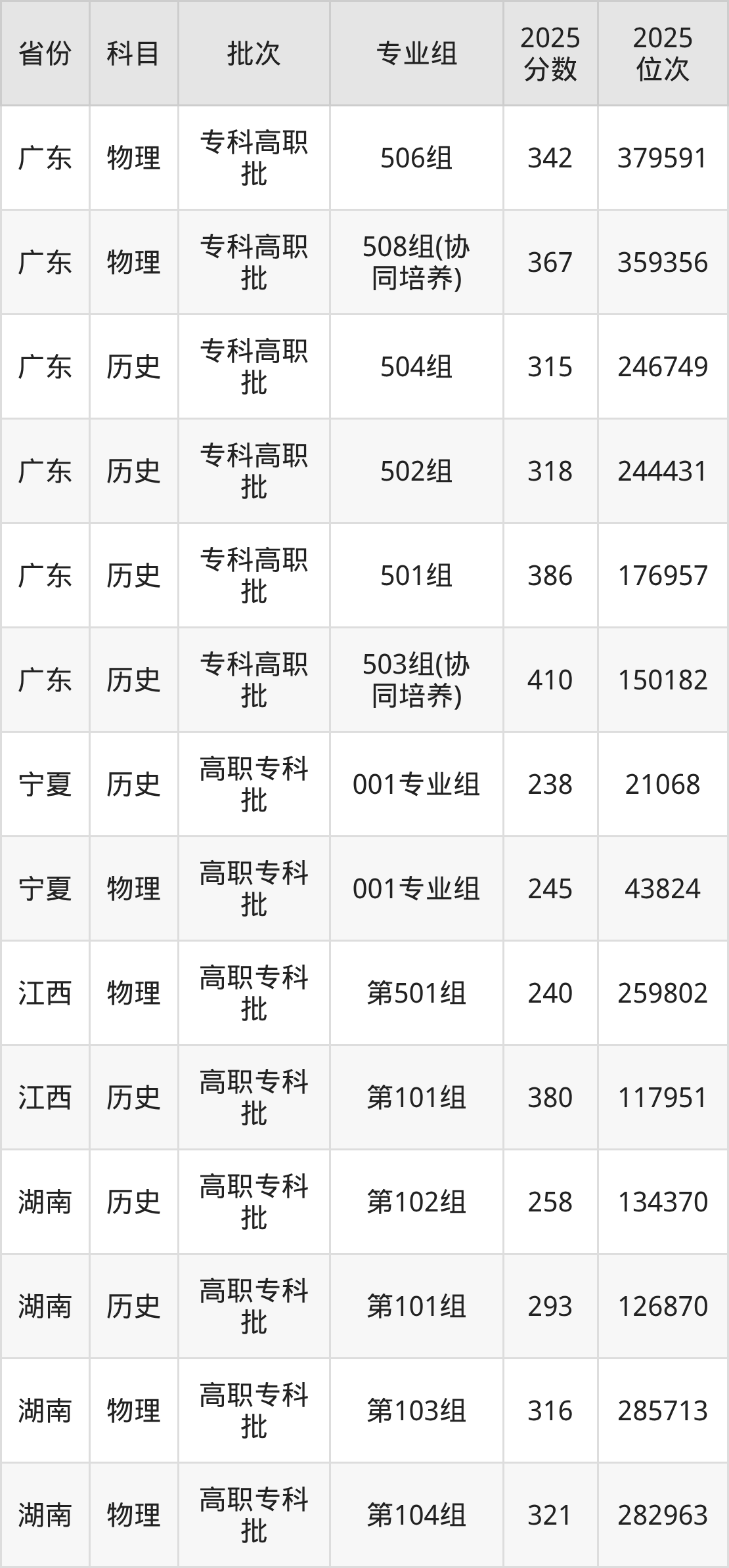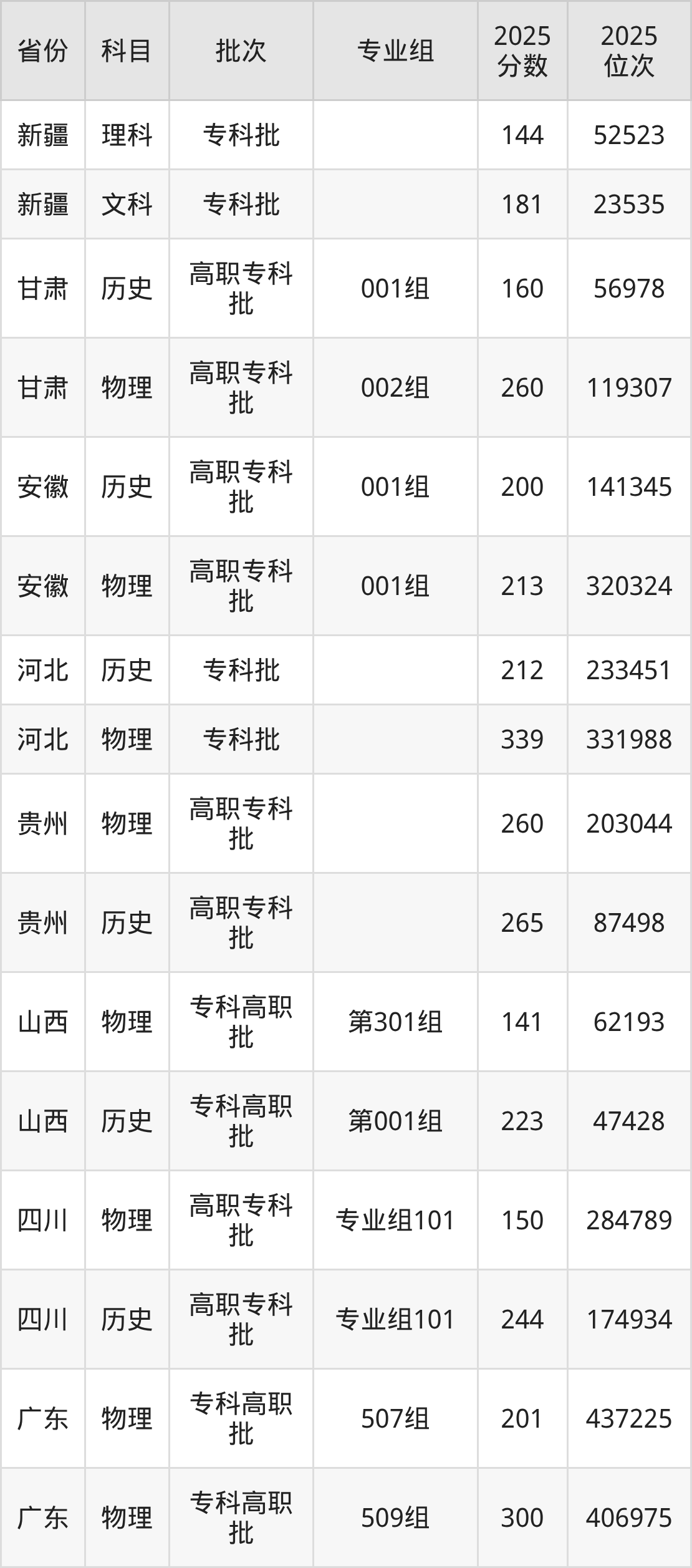 2025年广州城建职业学院全国录取分数线是141分到410分,录取最低在山西物理类(第301组)、录取最高在广东历史类(503组(协同培养))。各省各专业组最低分具有差异,详情如下: