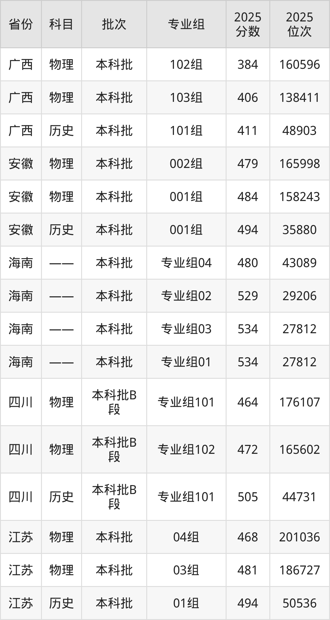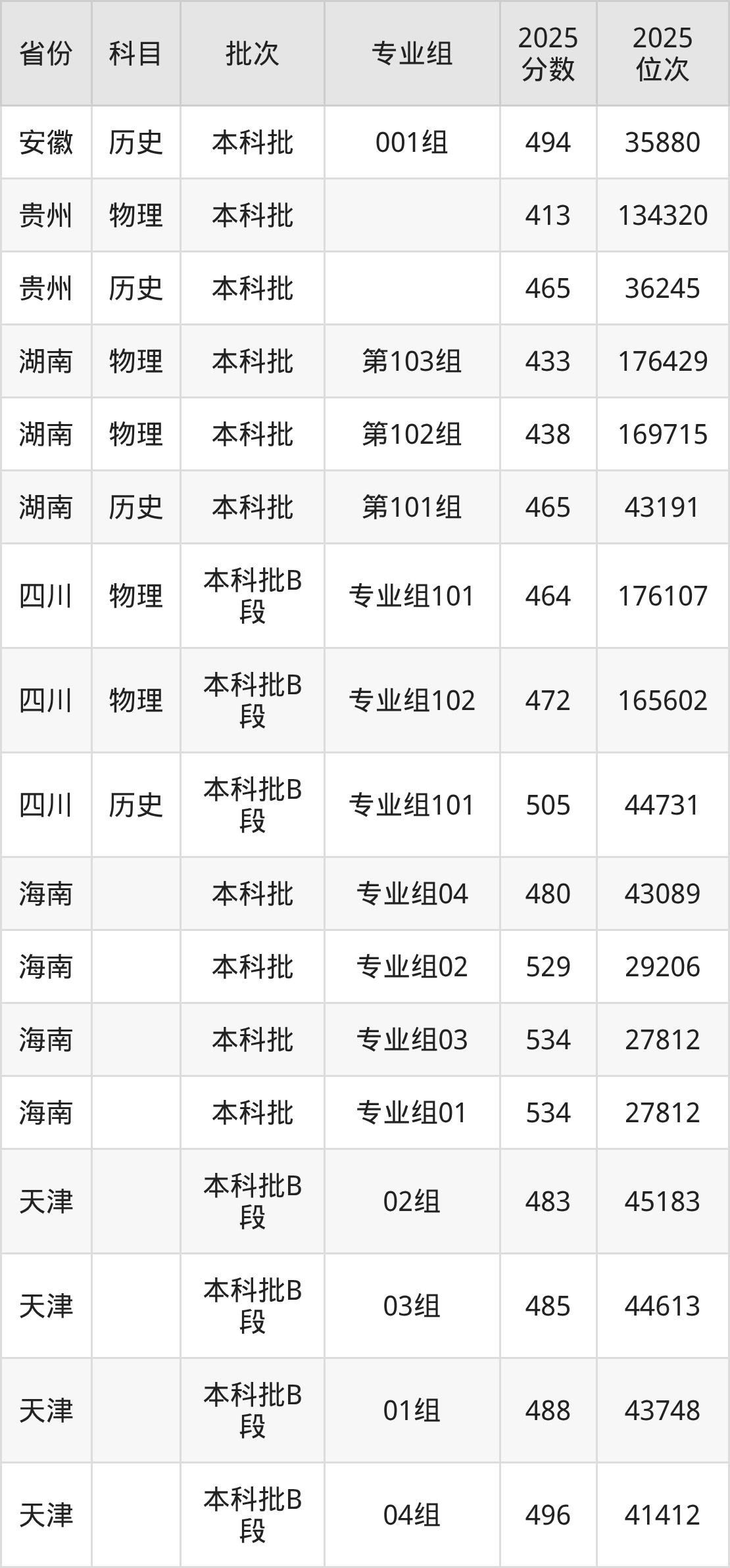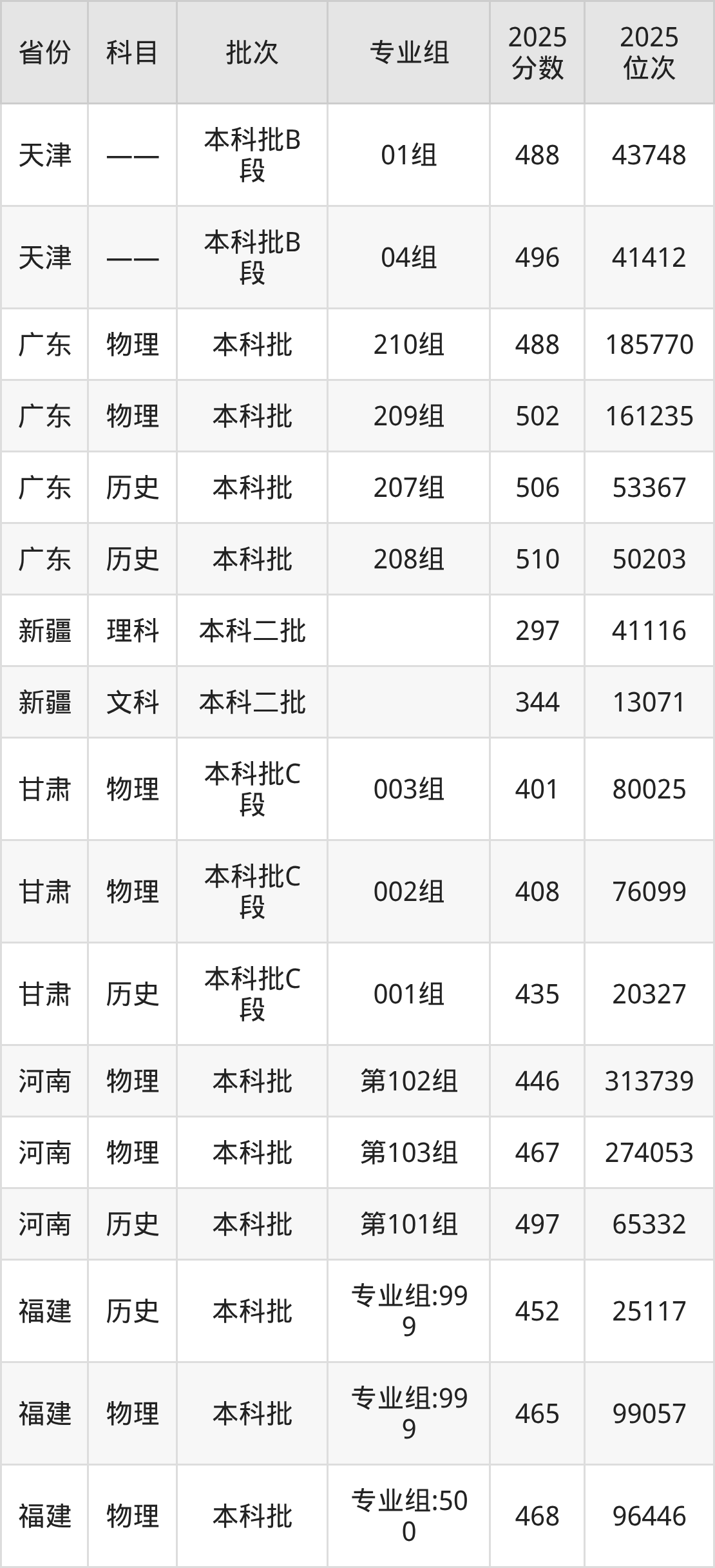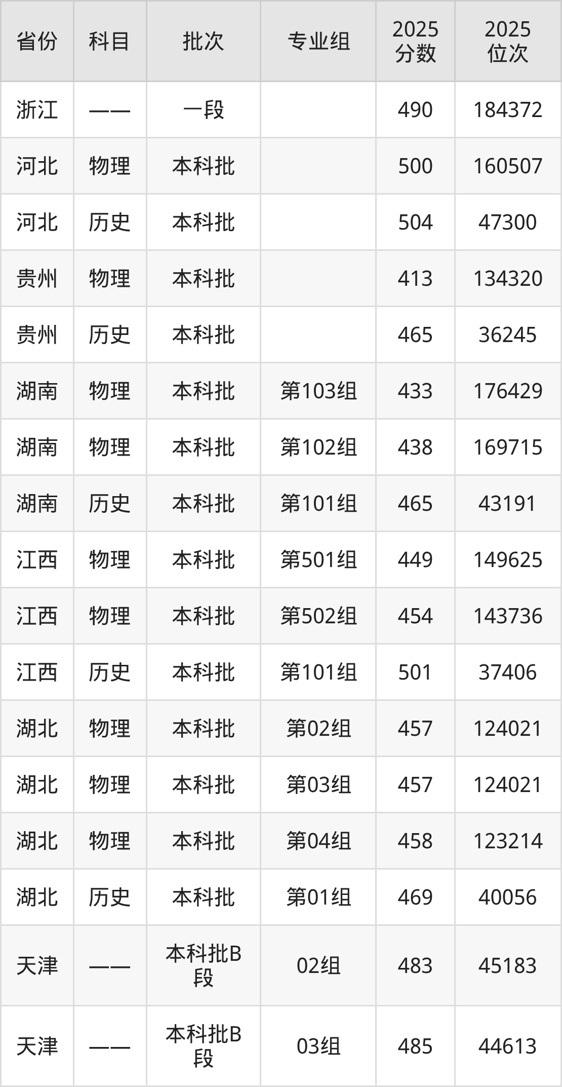 2025年投档录取最低分为465分,录取最低位次为36245名。