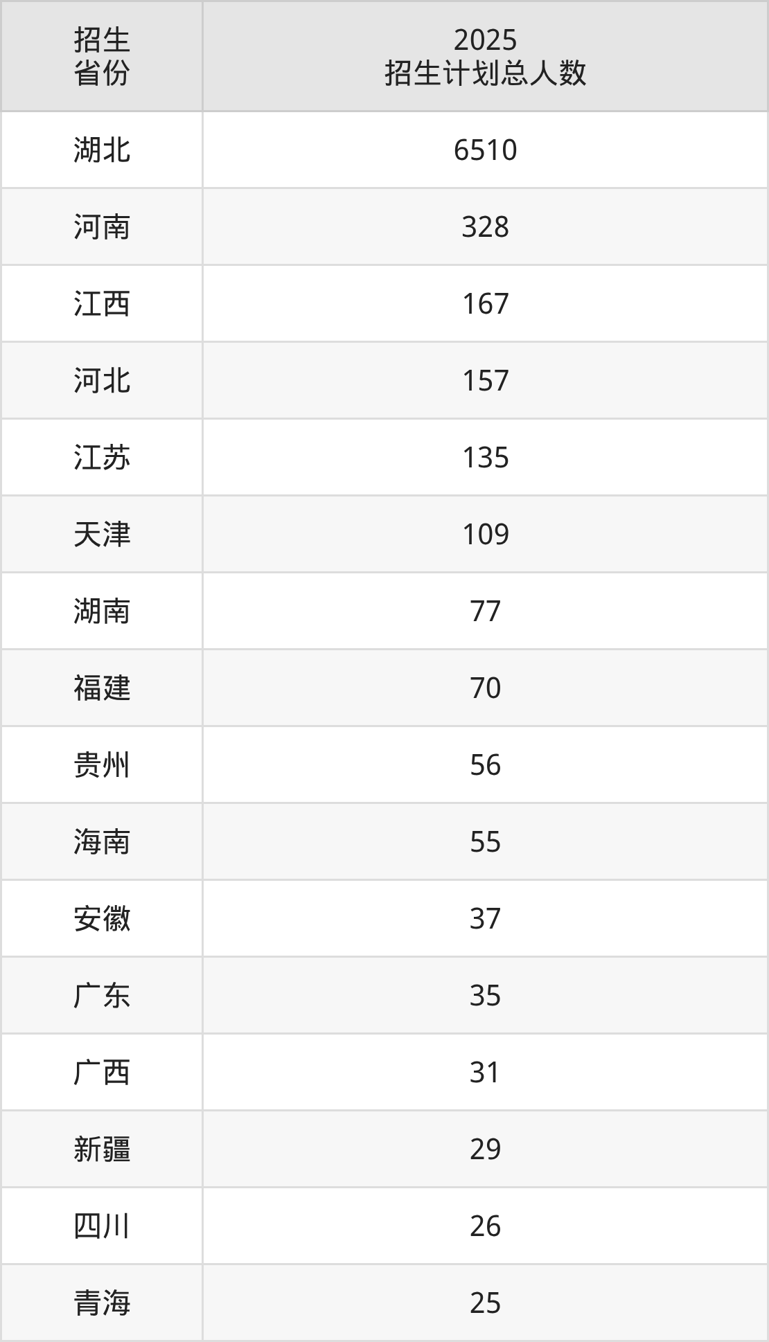 2025年武汉东湖学院面向全国17个省市开展本科招生;招生专业共33个,招生人数共2393人。2025年在湖北省招生计划总人数是6510人,其中,武汉东湖学院在湖北省招生人数最多的是计算机应用技术。武汉东湖学院在各省具体招生人数情况如下表。