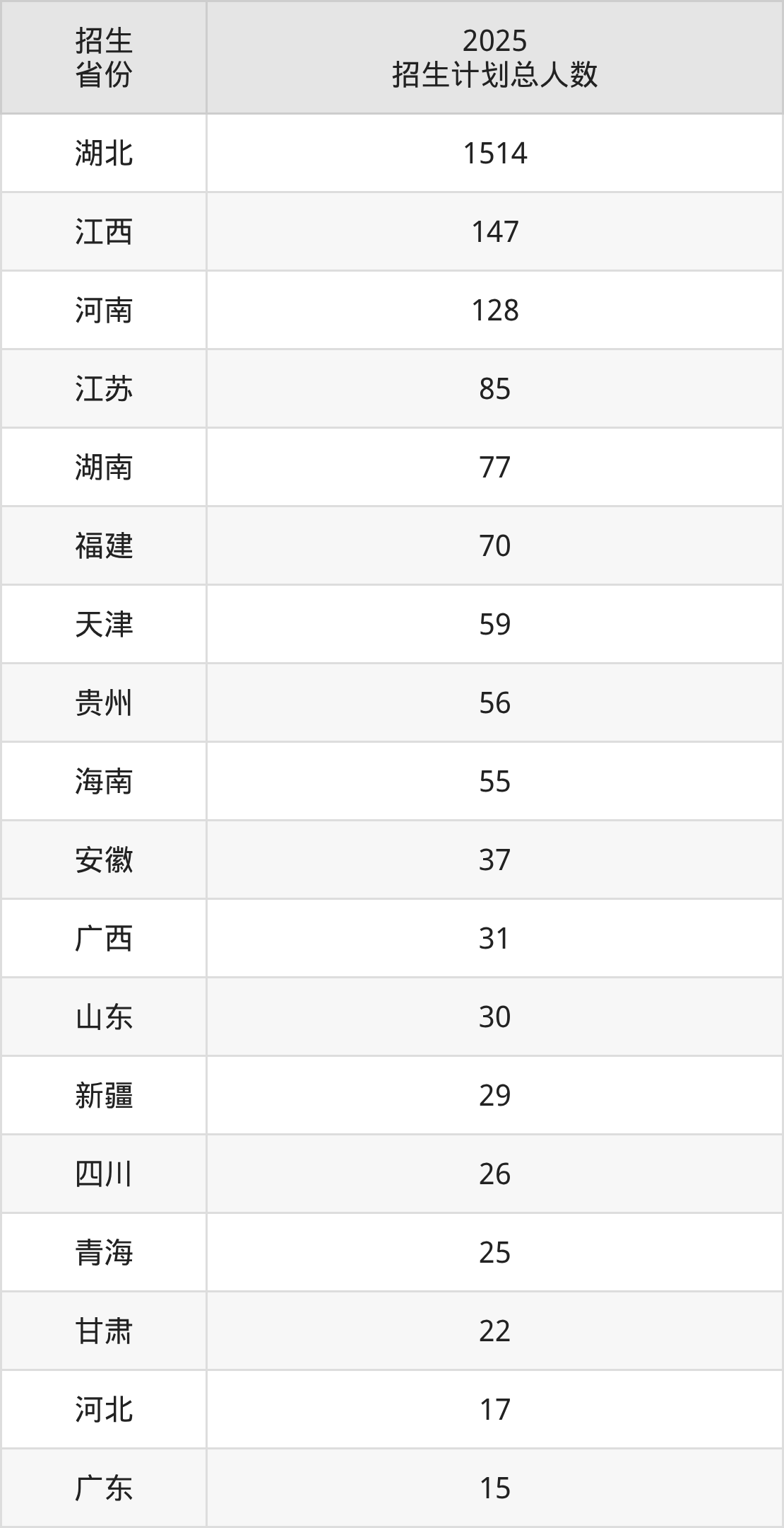 2025年武汉东湖学院面向全国18个省市开展本科招生;招生专业共33个,招生人数共2423人。2025年在湖北省招生计划总人数是1514人,其中,武汉东湖学院在湖北省招生人数最多的是计算机类。武汉东湖学院在各省具体招生人数情况如下表。