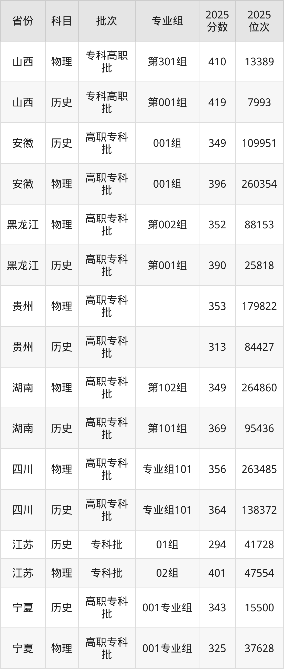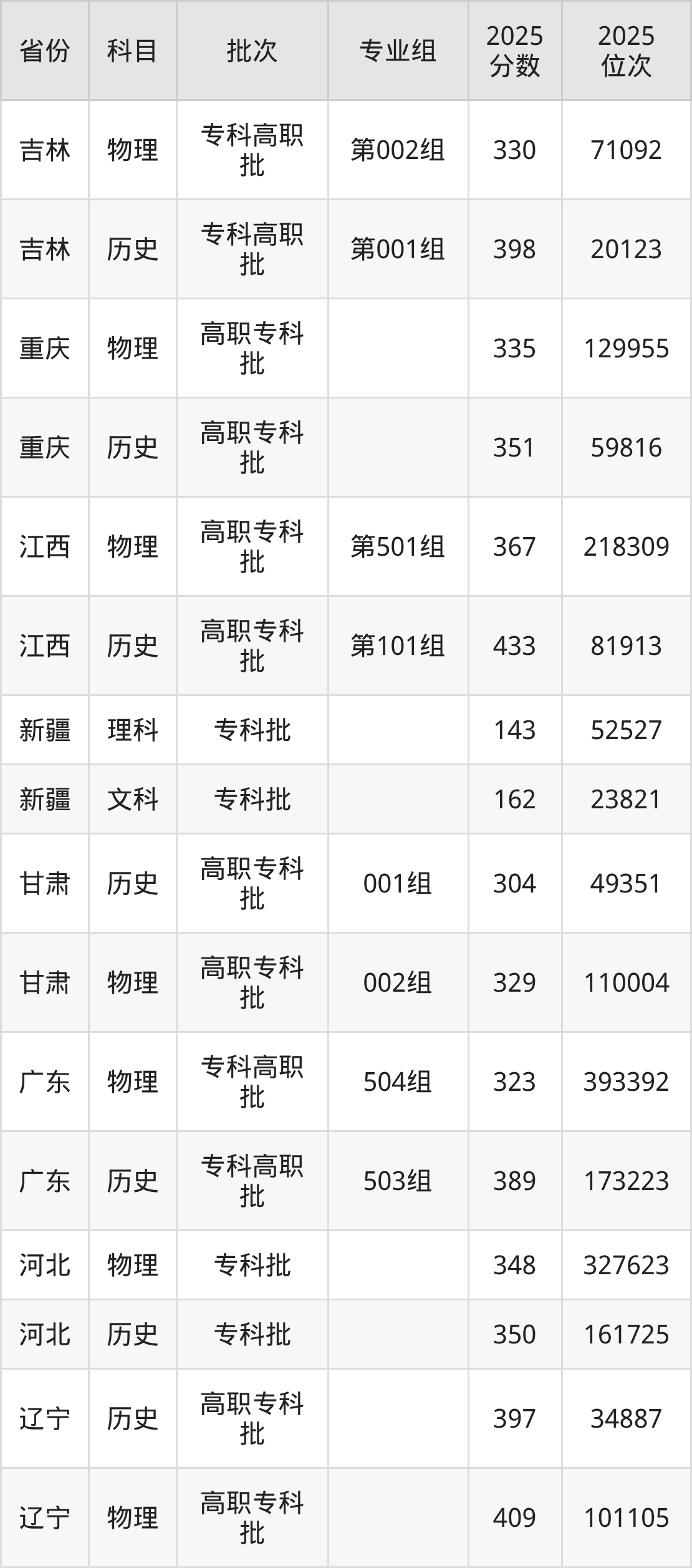 普通类专科物理类最低325分,专科历史类最低343分