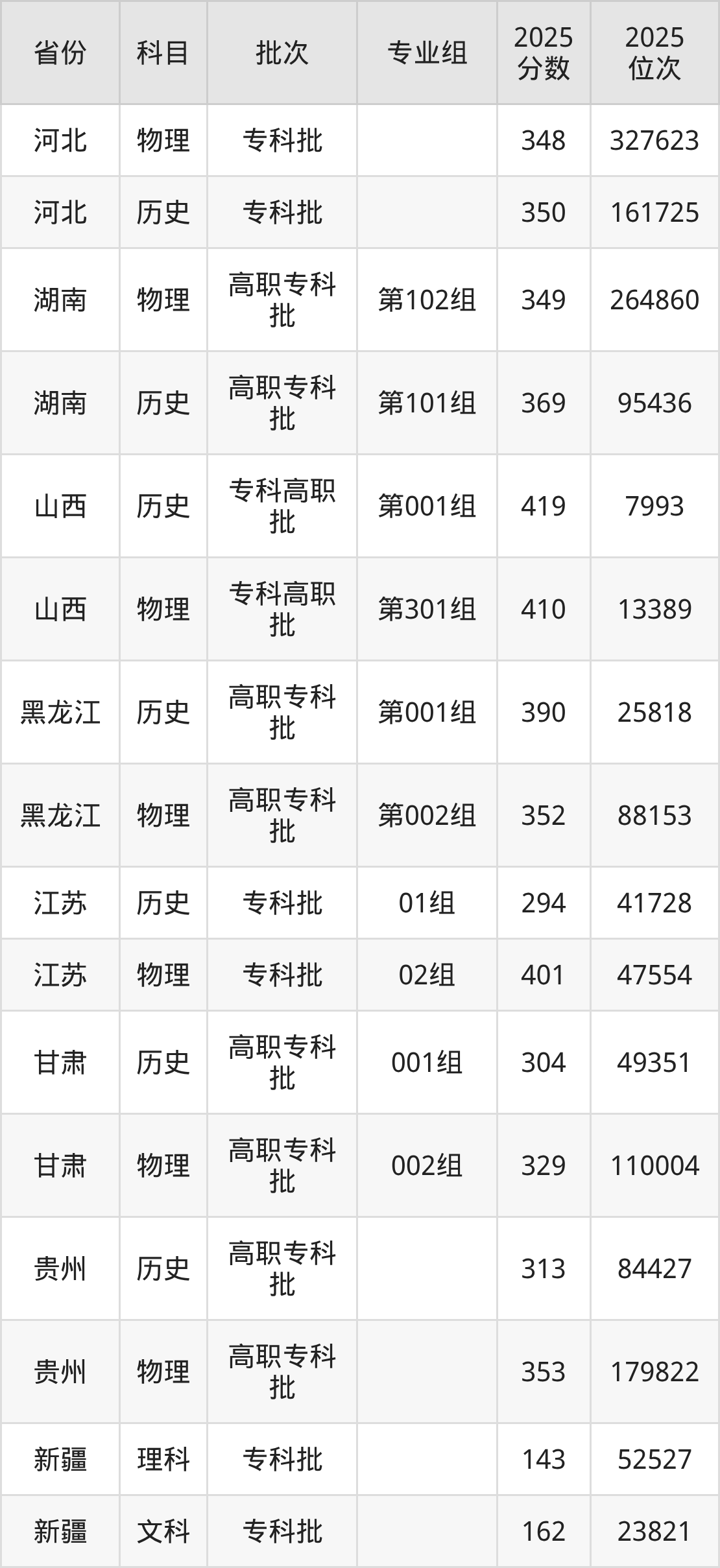 普通类专科物理类最低401分,专科历史类最低294分