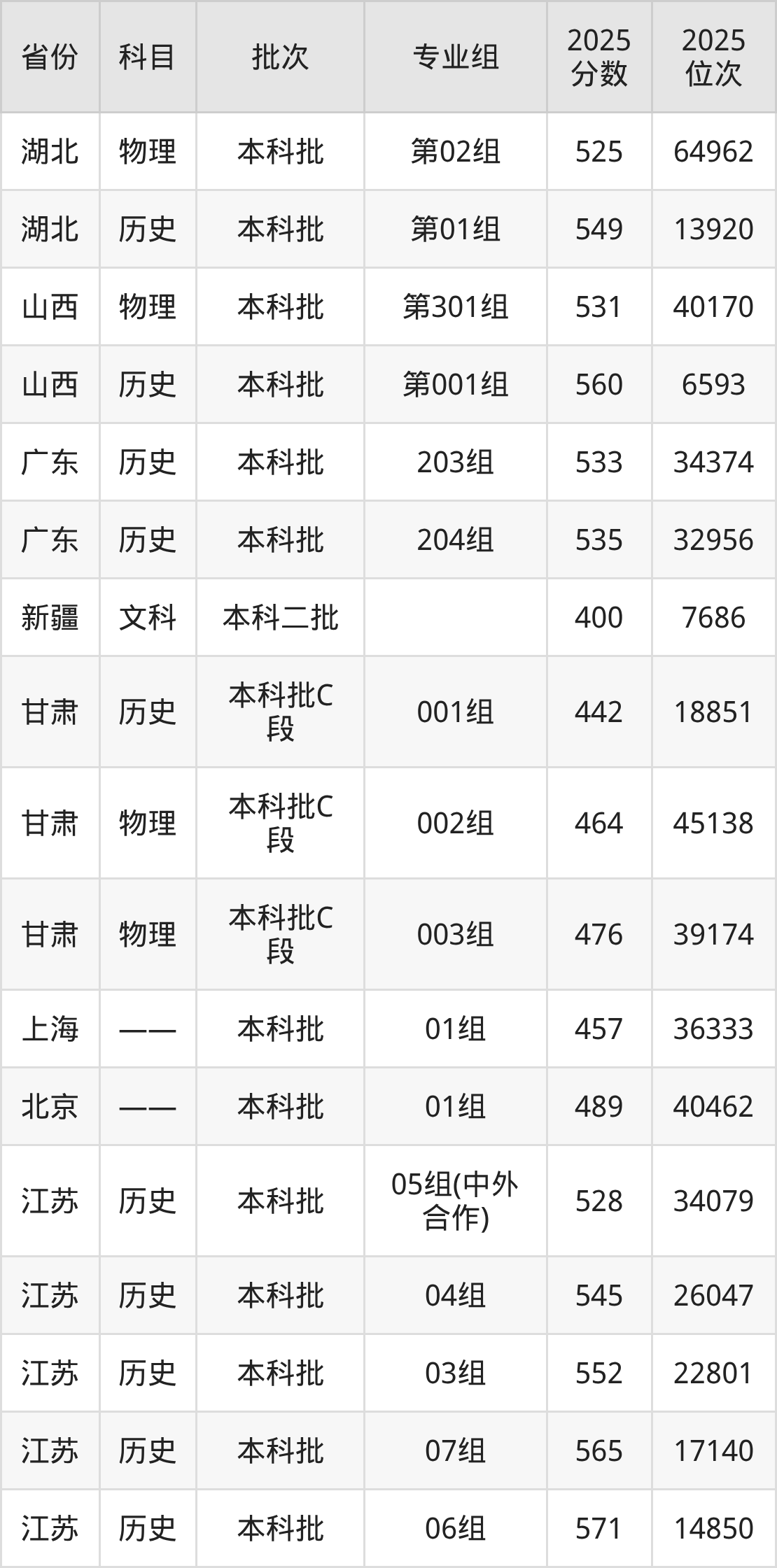 2025年在本科文科进行招生,各专业组分数线详情如下: