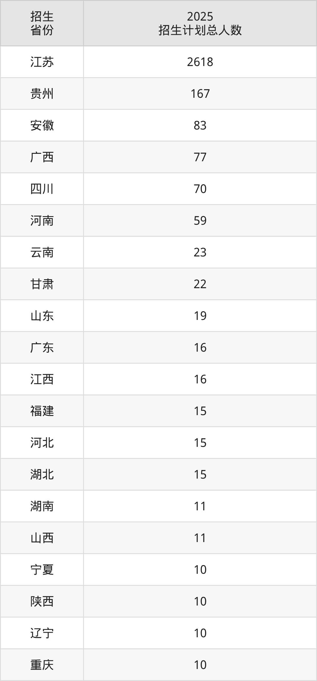 2025年南京晓庄学院面向全国24个省市开展本科招生;招生专业共39个,招生人数共3291人。2025年在江苏省招生计划总人数是2618人,其中,南京晓庄学院在江苏省招生人数最多的是电子信息科学与技术。南京晓庄学院在各省具体招生人数情况如下表。