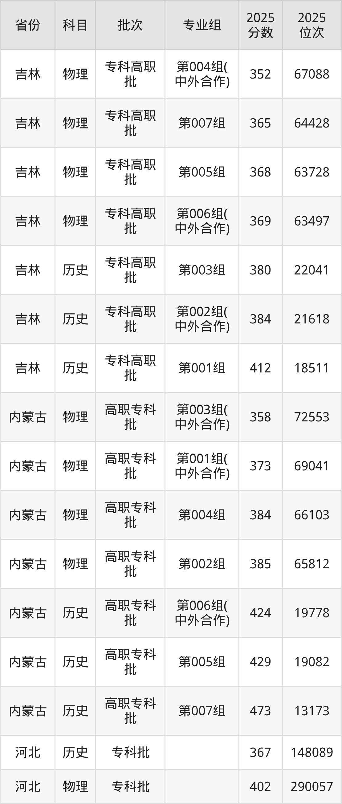 普通类专科历史类最低367分,专科物理类最低402分