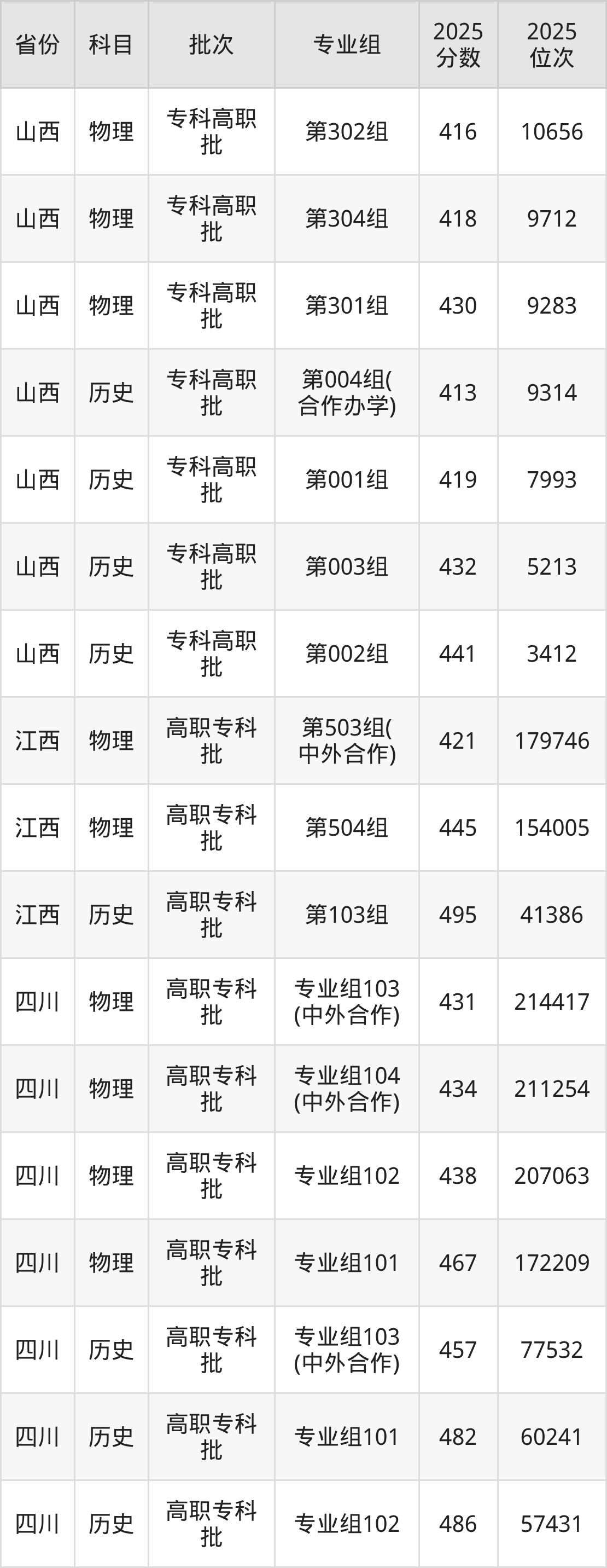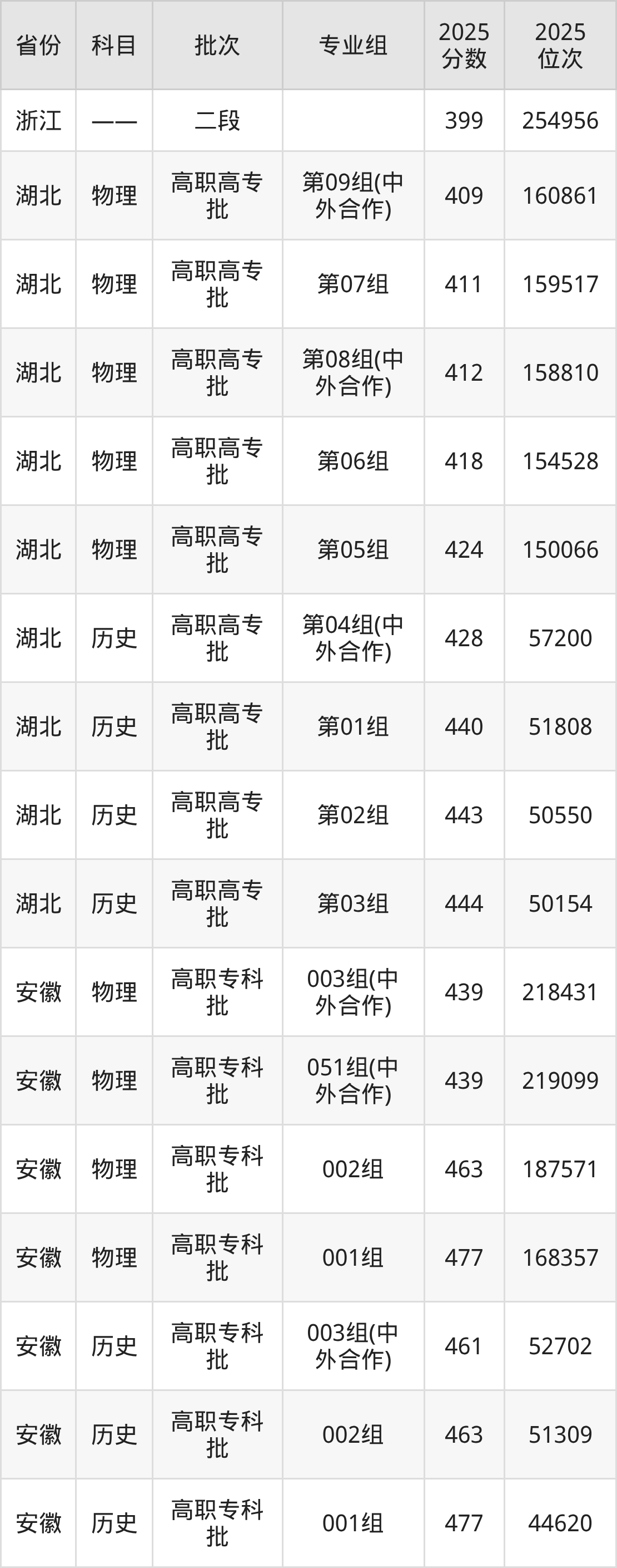普通类专科物理类最低439分,专科历史类最低461分