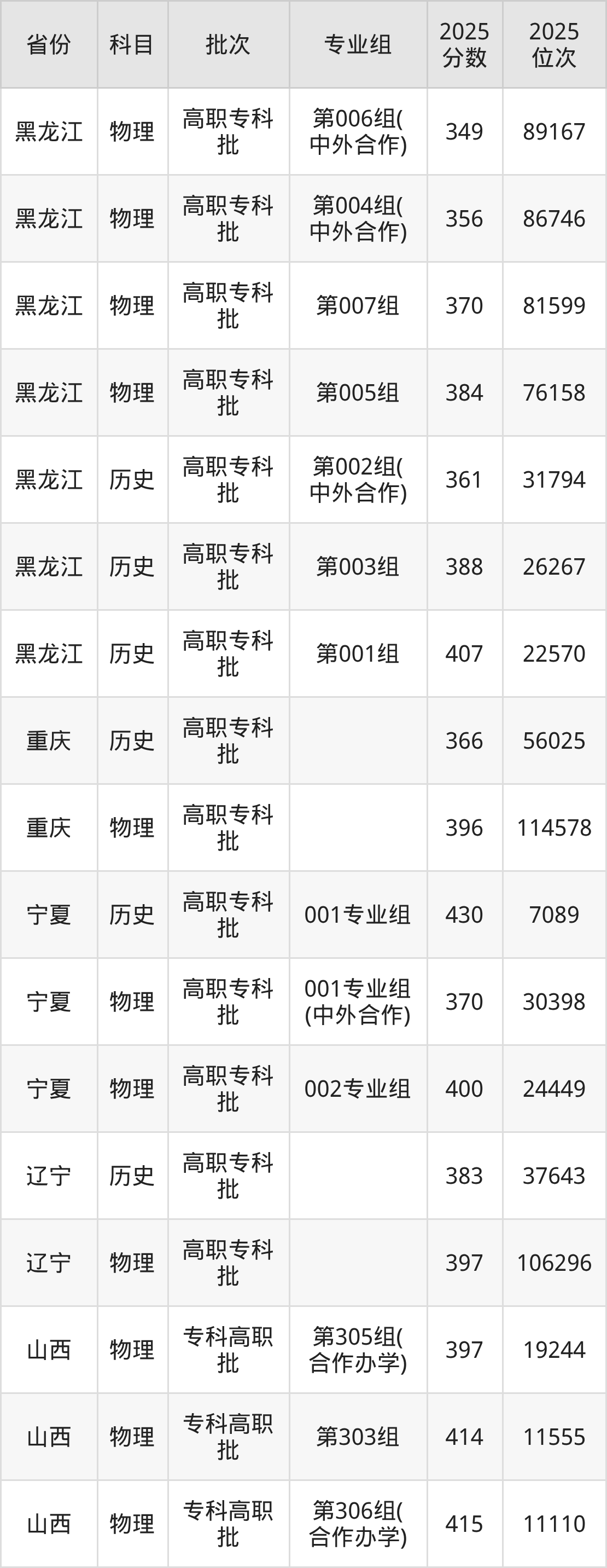 普通类专科物理类最低349分,专科历史类最低361分