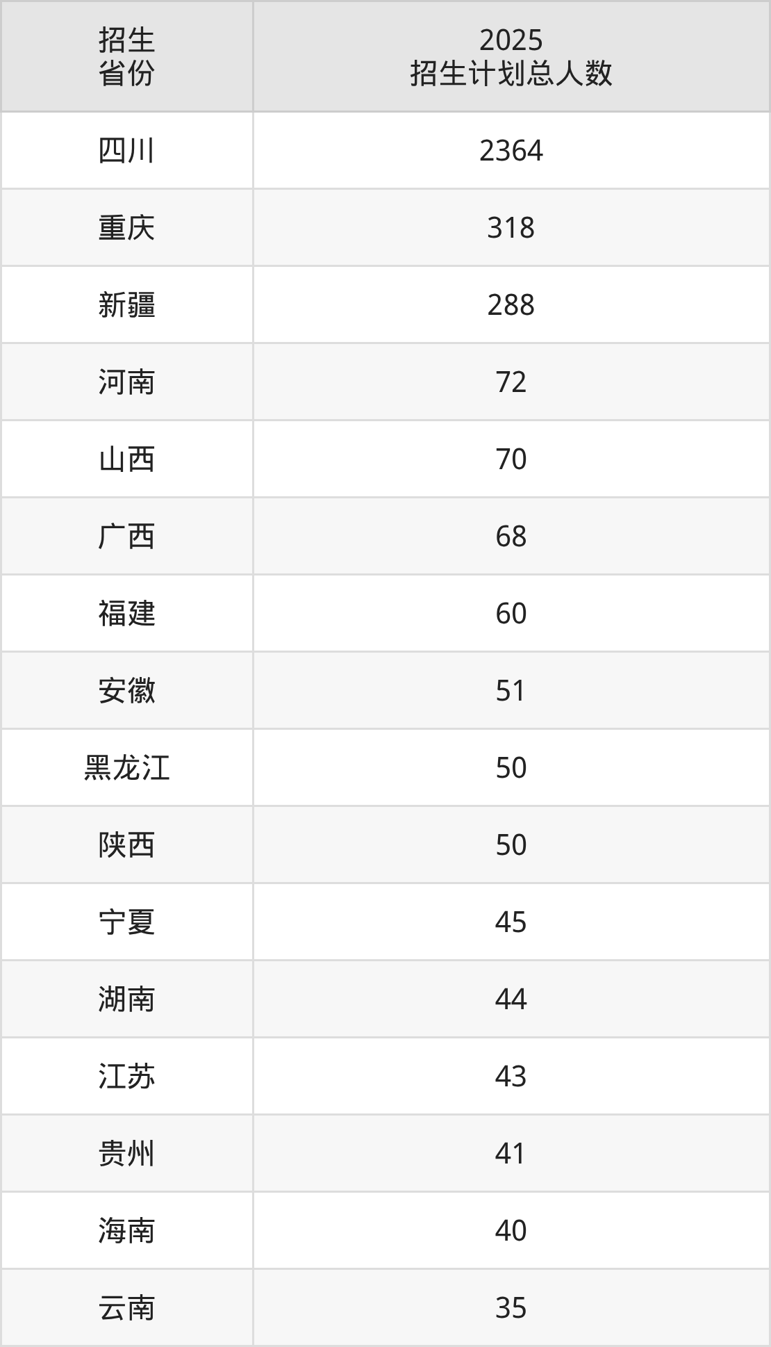 2025年西南财经大学天府学院面向全国28个省市开展本科招生;招生专业共36个,招生人数共3478人。2025年在四川省招生计划总人数是2364人,其中,西南财经大学天府学院在四川省招生人数最多的是会计学。西南财经大学天府学院在各省具体招生人数情况如下表。