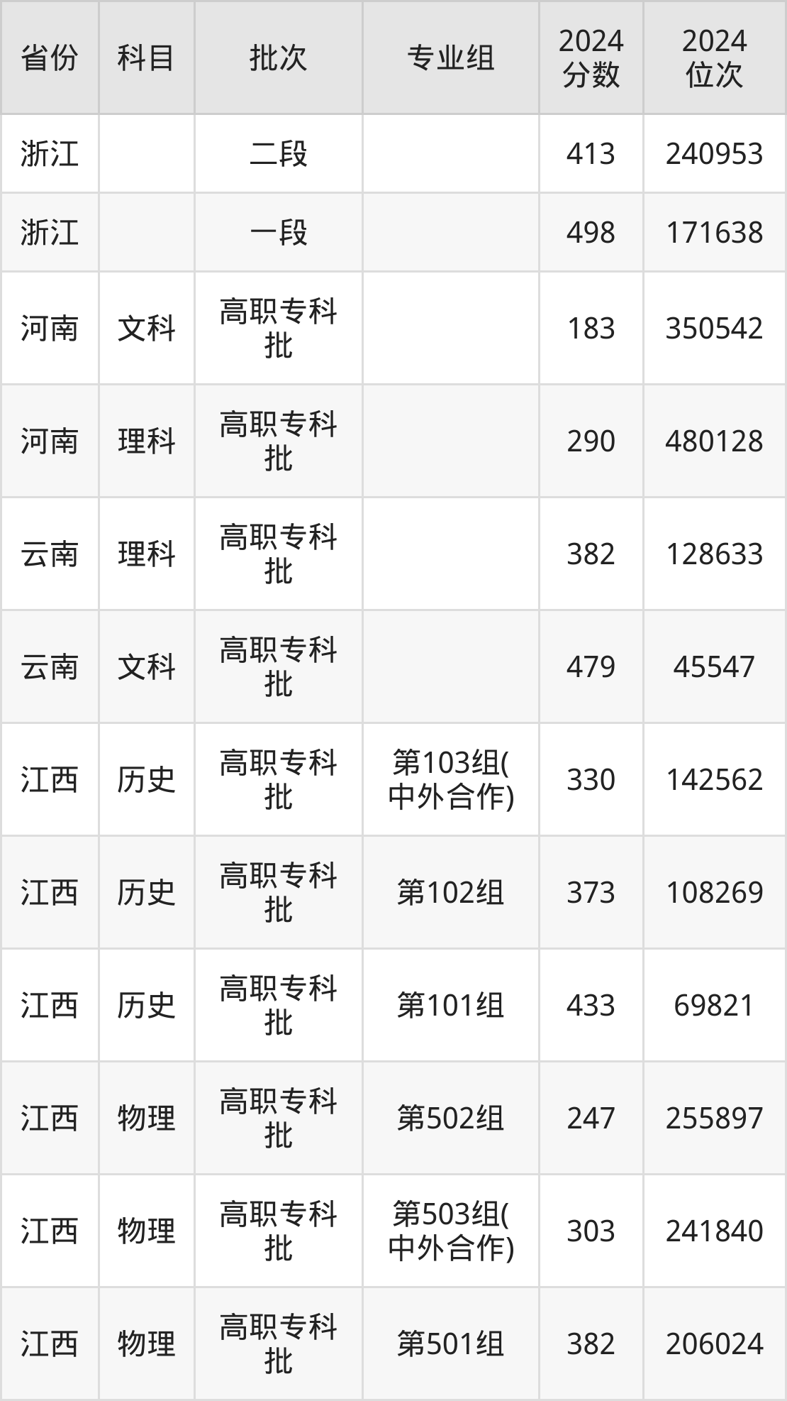 2024年赣州师范高等专科学校全国录取分数线是183分到498分,录取最低在河南文科、录取最高在浙江。各省各专业组最低分具有差异,详情如下: