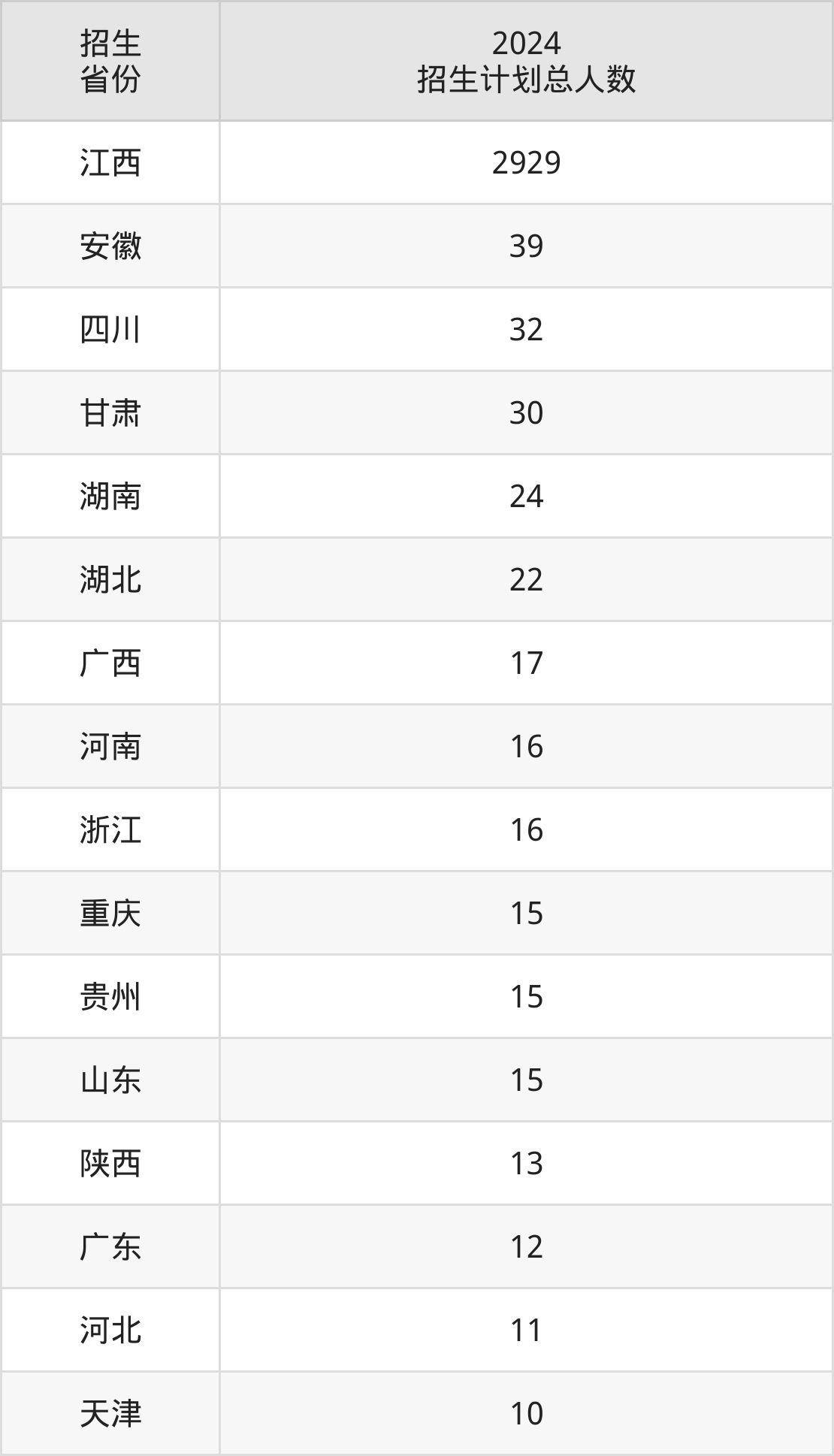 2024年赣州师范高等专科学校面向全国23个省市开展专科招生;招生专业共23个,招生人数共3256人。2024年在江西省招生计划总人数是2929人,其中,赣州师范高等专科学校在江西省招生人数最多的是软件技术。赣州师范高等专科学校在各省具体招生人数情况如下表。
