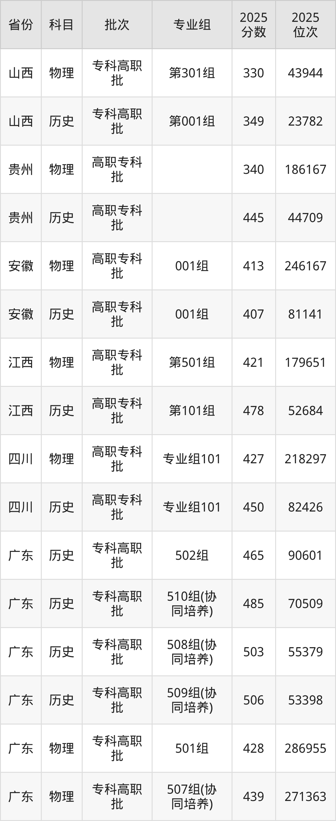 广东工贸职业技术学院第301组:2025年投档录取最低分为330分,录取最低位次为43944名。