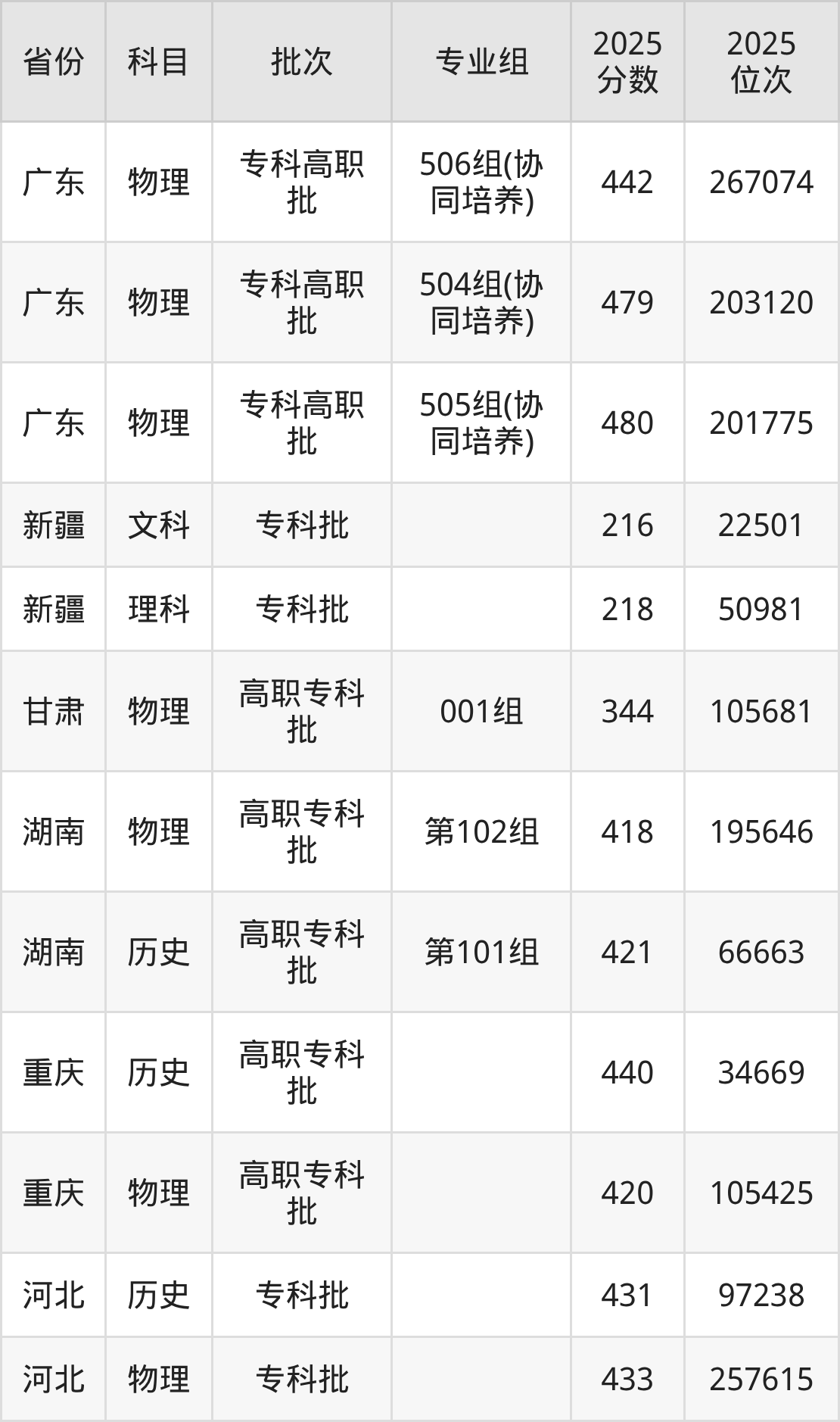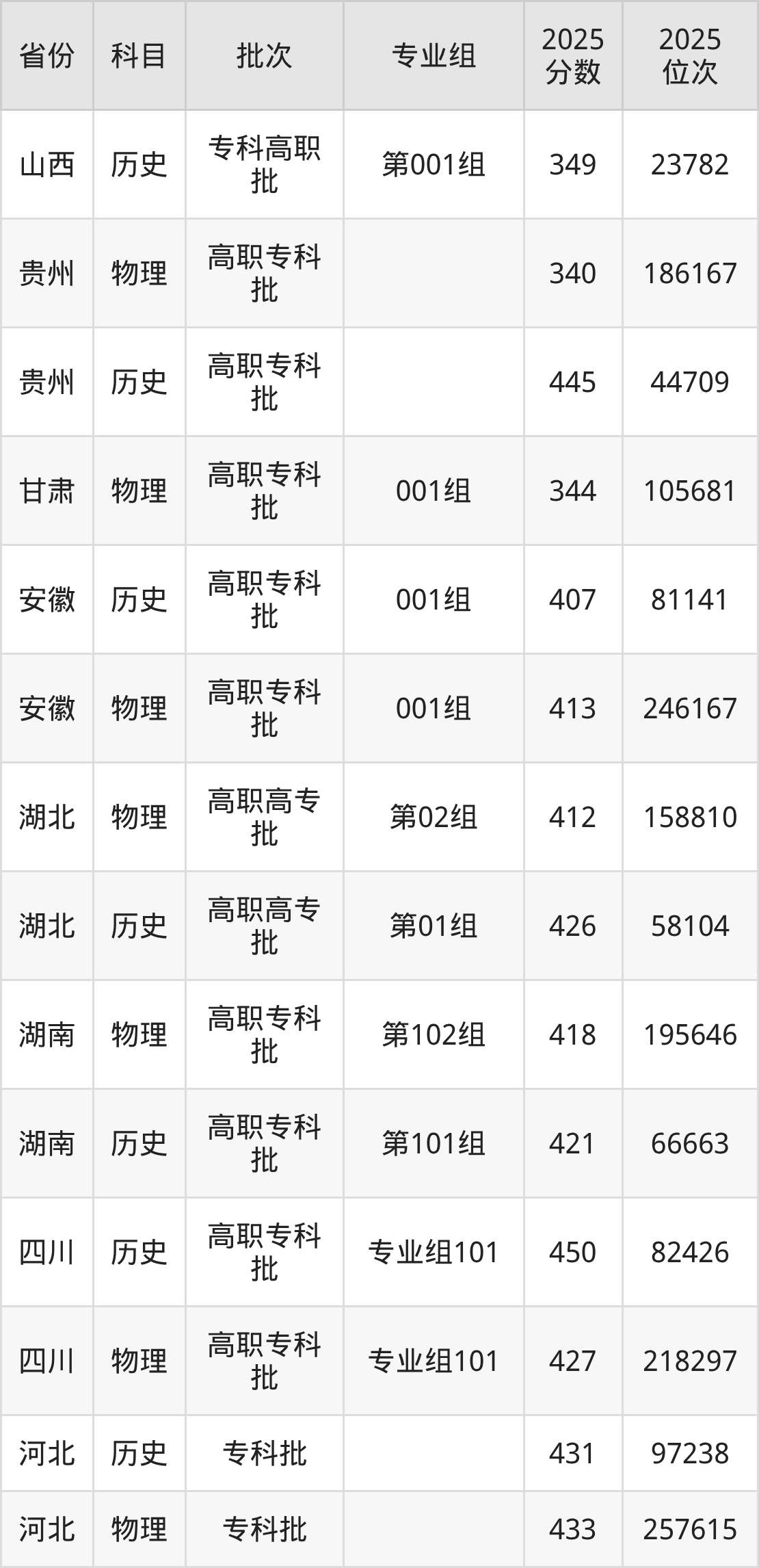2025年在专科物理类进行招生,各专业组分数线详情如下: