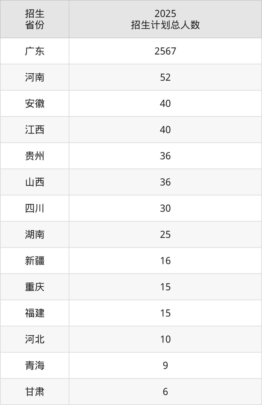 2025年广东工贸职业技术学院面向全国14个省市开展专科招生;招生专业共44个,招生人数共2897人。2025年在广东省招生计划总人数是2567人,其中,广东工贸职业技术学院在广东省招生人数最多的是软件技术。广东工贸职业技术学院在各省具体招生人数情况如下表。