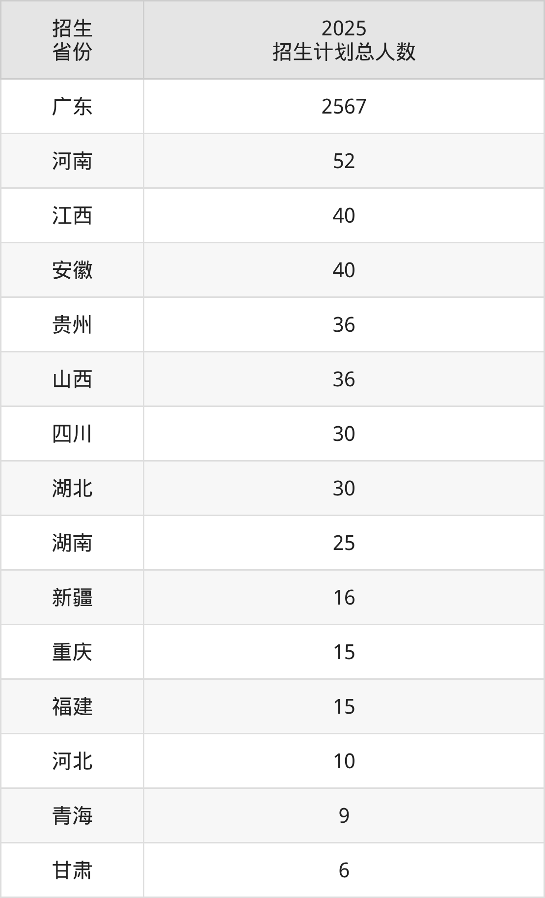 2025年广东工贸职业技术学院面向全国15个省市开展专科招生;招生专业共44个,招生人数共2927人。2025年在广东省招生计划总人数是2567人,其中,广东工贸职业技术学院在广东省招生人数最多的是软件技术。广东工贸职业技术学院在各省具体招生人数情况如下表。