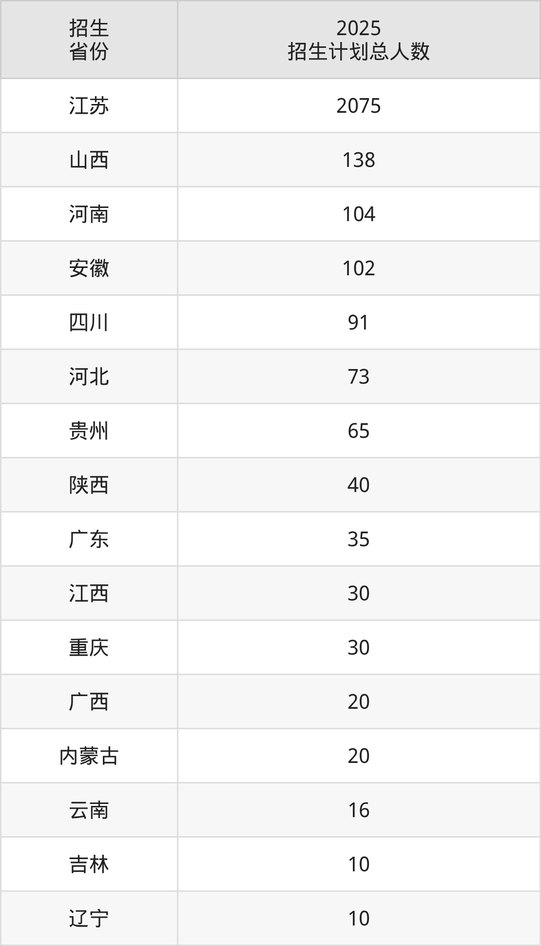 2025年中国矿业大学徐海学院面向全国17个省市开展本科招生;招生专业共26个,招生人数共2869人。2025年在江苏省招生计划总人数是2075人,其中,中国矿业大学徐海学院在江苏省招生人数最多的是汉语言文学。中国矿业大学徐海学院在各省具体招生人数情况如下表。