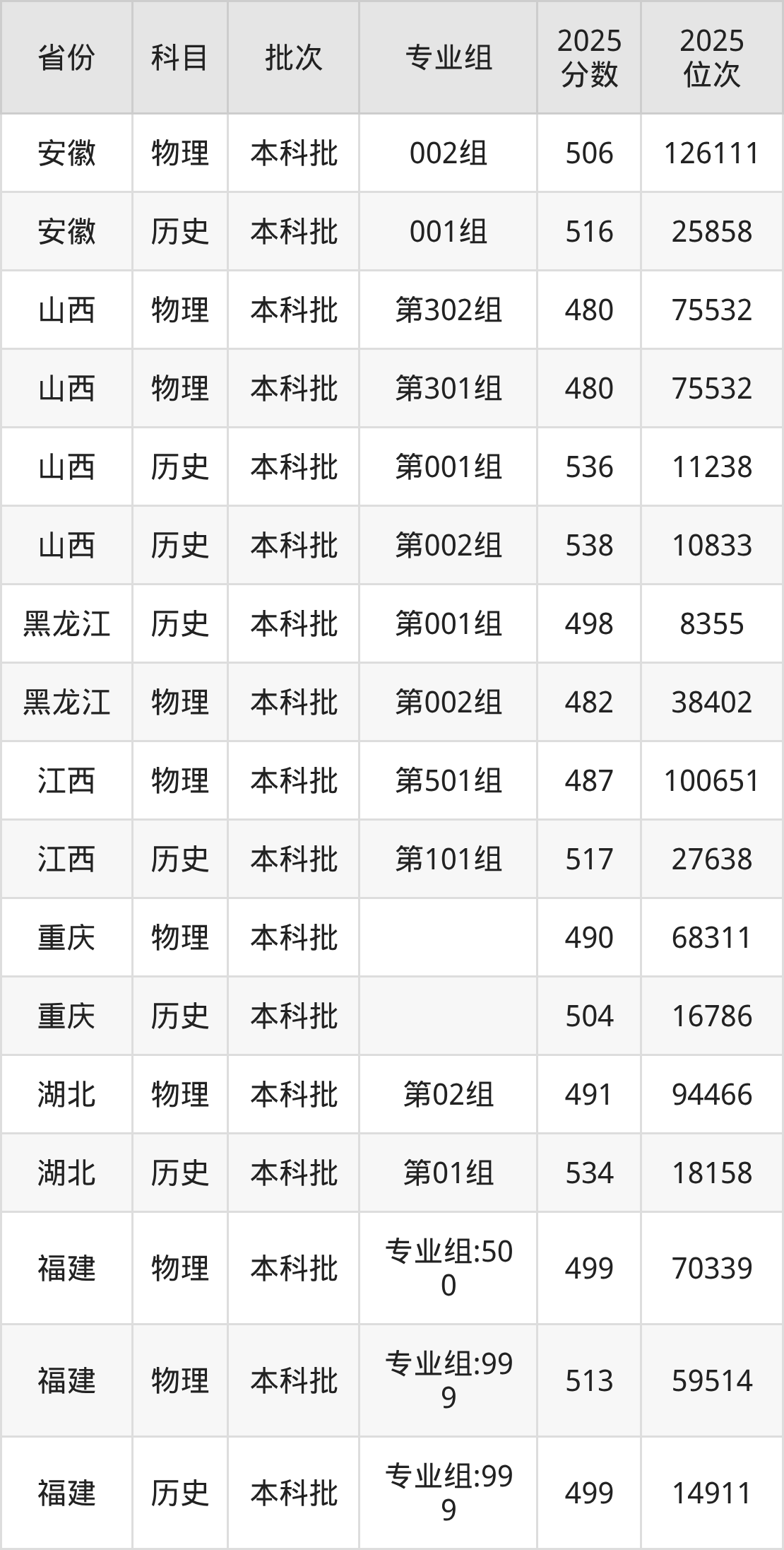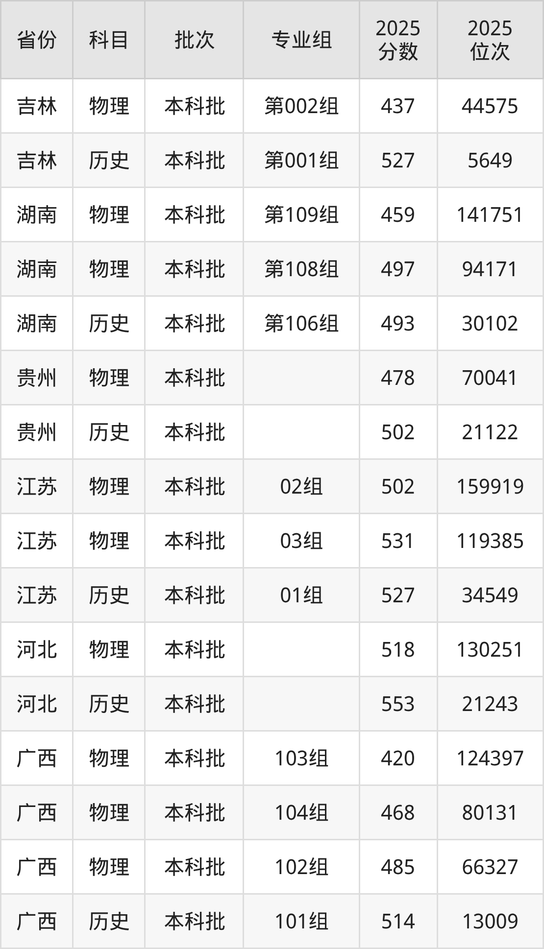 2025年投档录取最低分为502分,录取最低位次为21122名。
