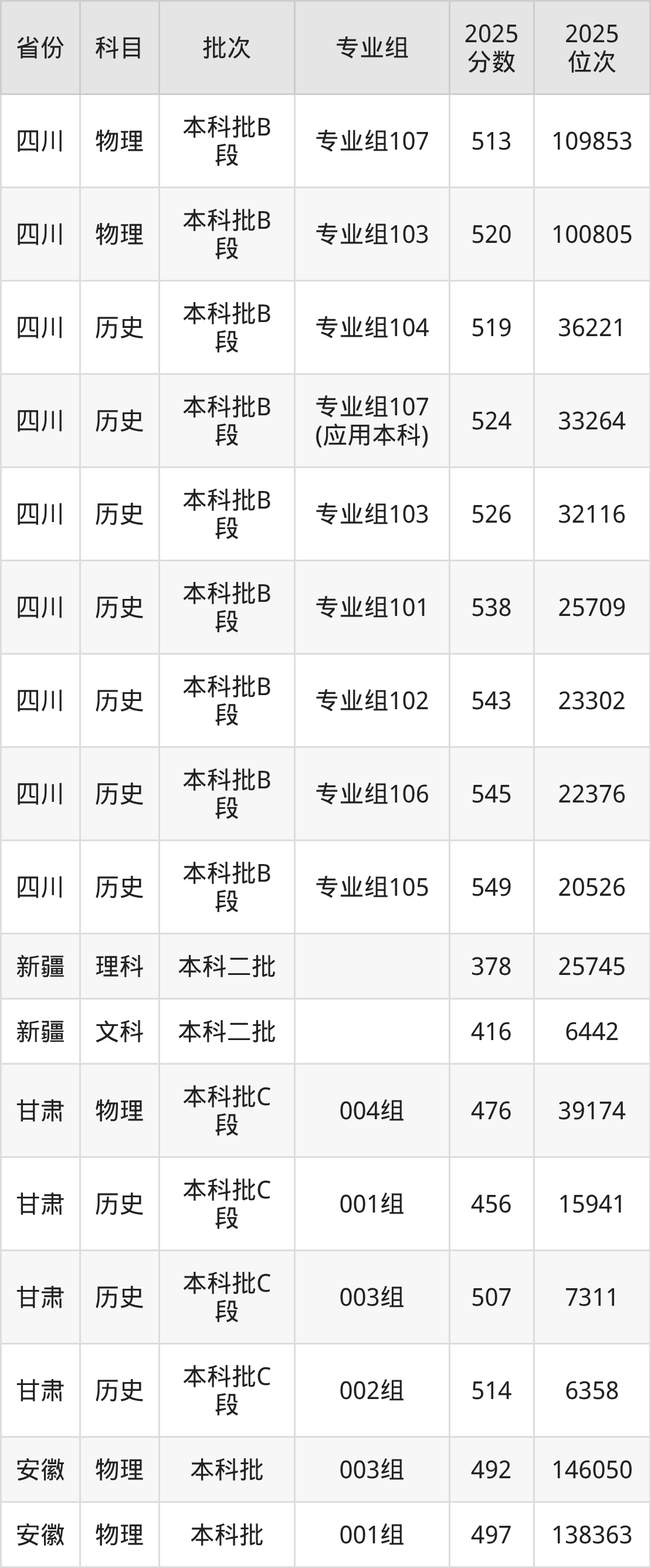 绵阳师范学院专业组107:2025年投档录取最低分为513分,录取最低位次为109853名。