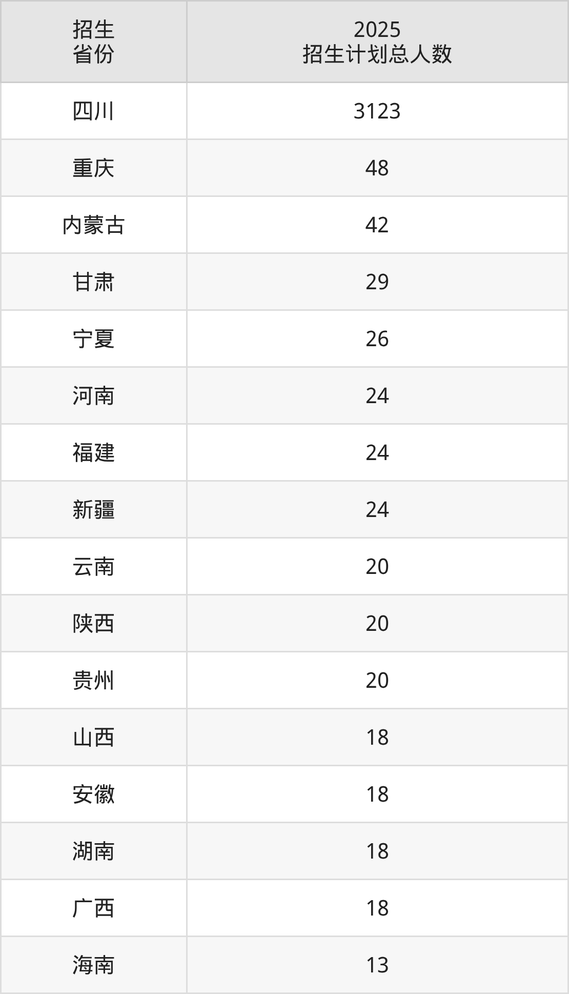 2025年绵阳师范学院面向全国24个省市开展本科招生;招生专业共40个,招生人数共3551人。2025年在四川省招生计划总人数是3123人,其中,绵阳师范学院在四川省招生人数最多的是应用化学。绵阳师范学院在各省具体招生人数情况如下表。