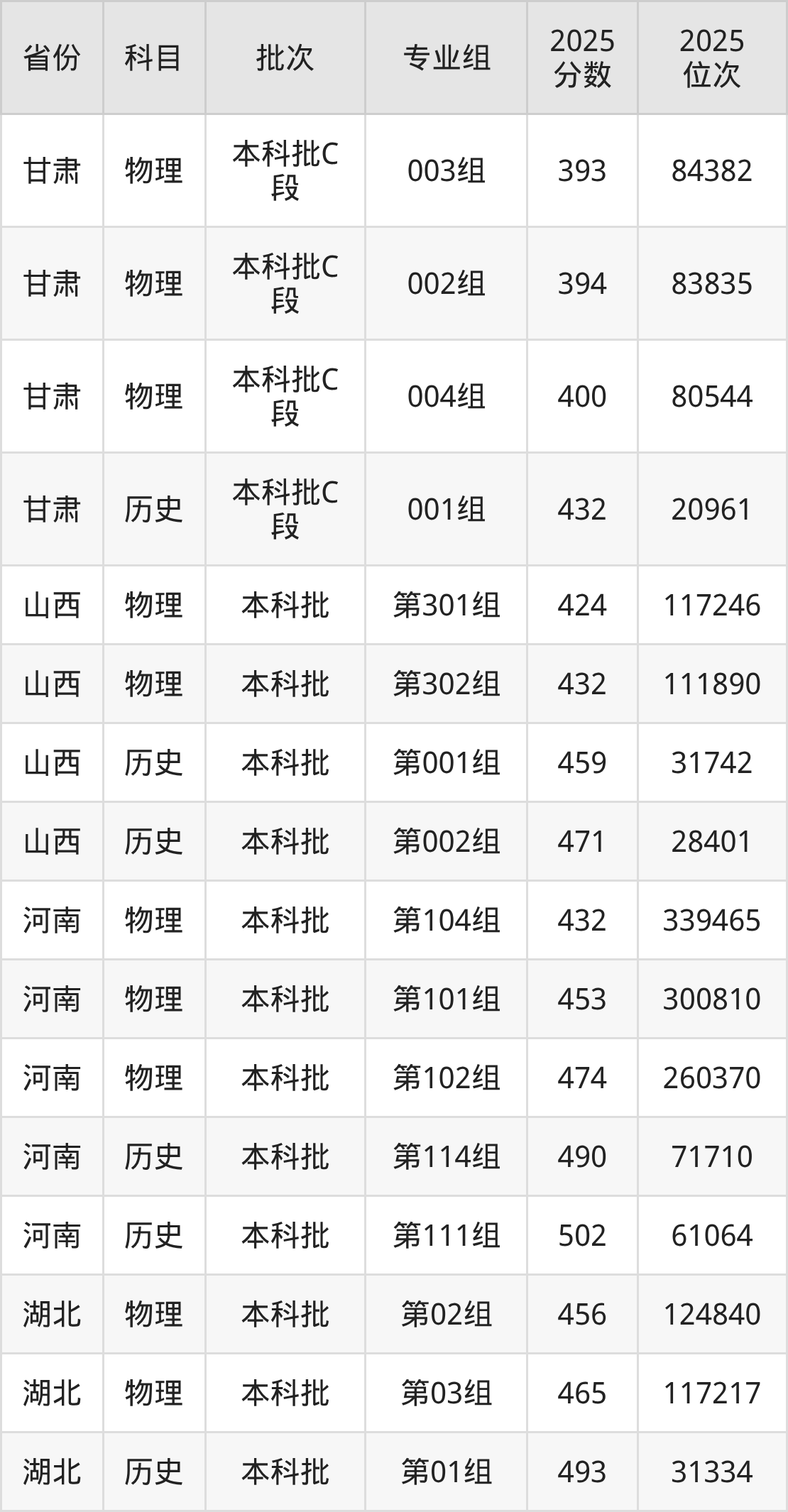 2025年投档录取最低分为465分,录取最低位次为35954名。