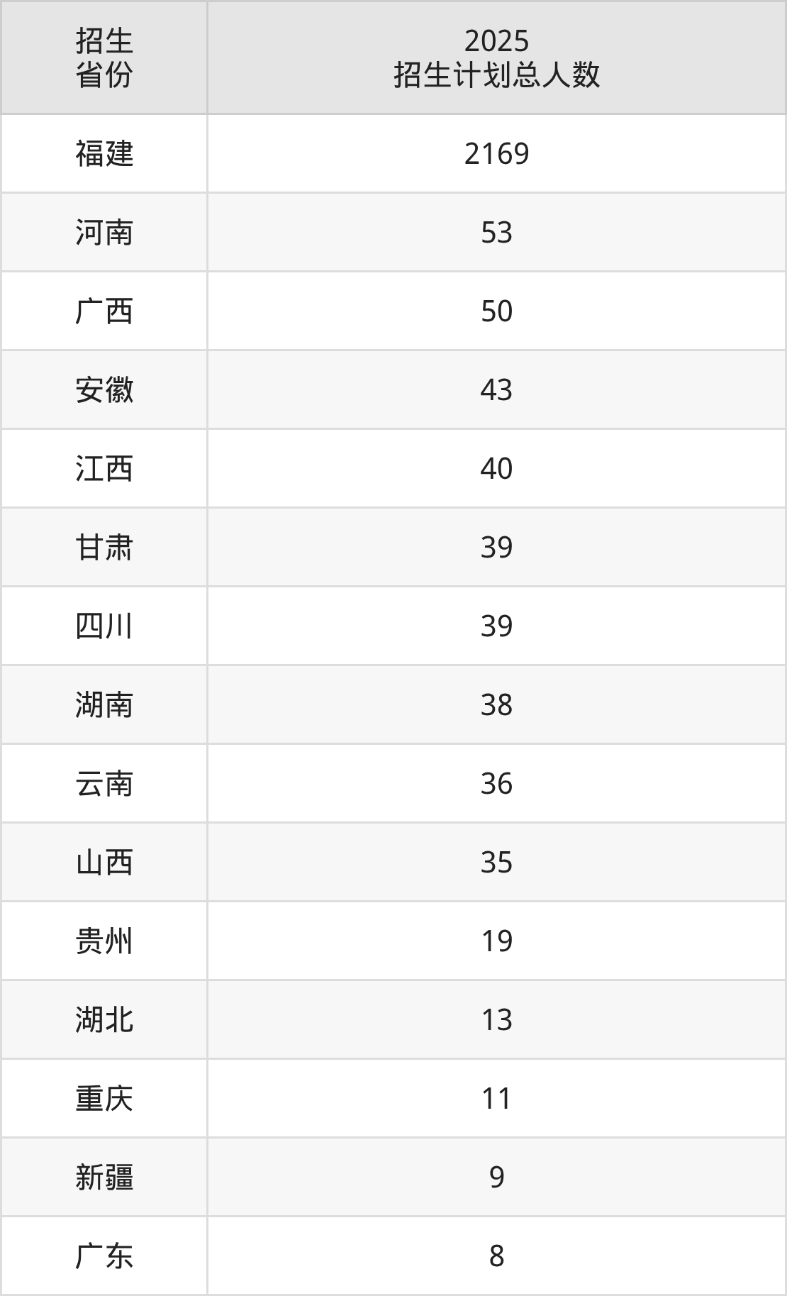 2025年福建师范大学协和学院面向全国15个省市开展本科招生;招生专业共26个,招生人数共2602人。2025年在福建省招生计划总人数是2169人,其中,福建师范大学协和学院在福建省招生人数最多的是网络工程。福建师范大学协和学院在各省具体招生人数情况如下表。