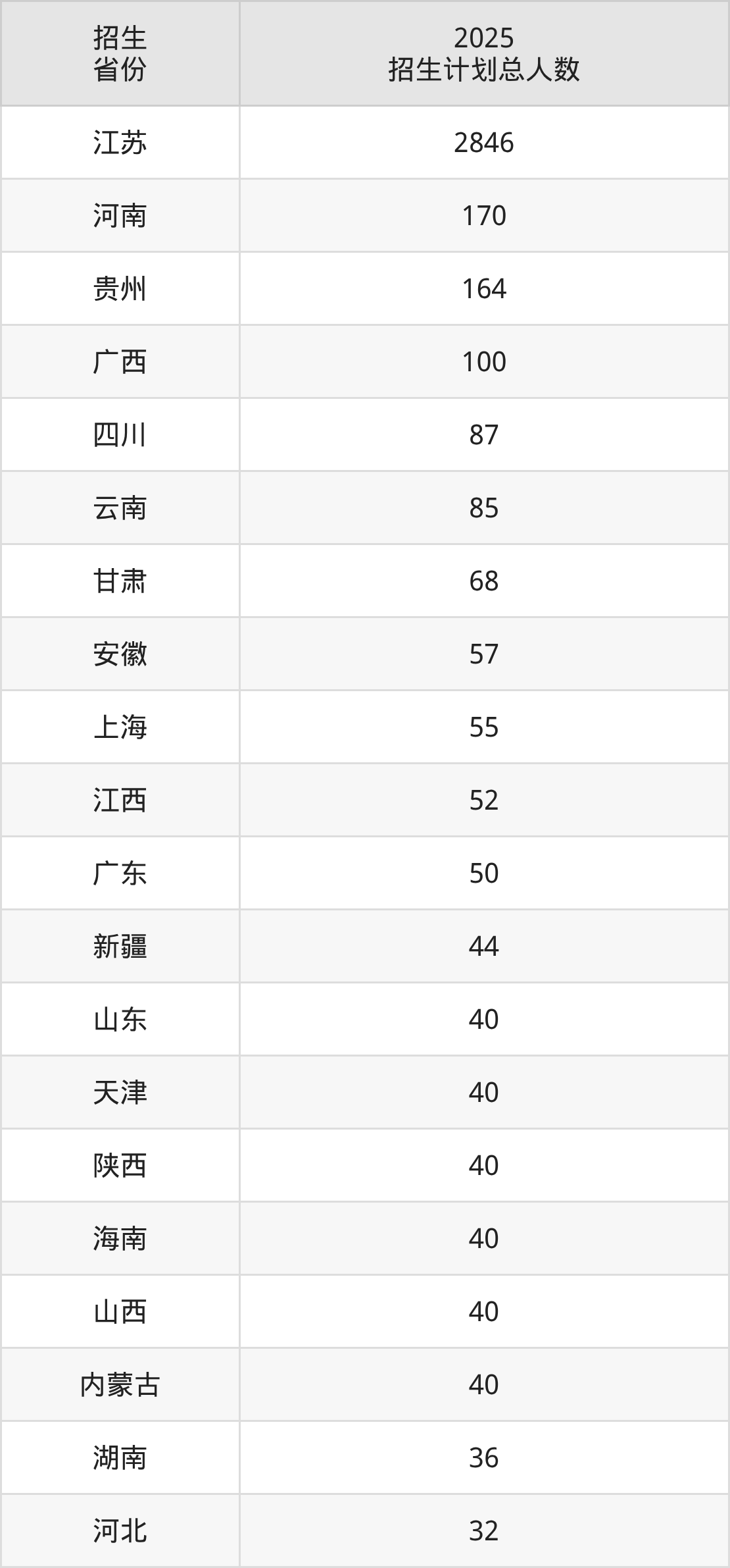 2025年南京审计大学面向全国29个省市开展本科招生;招生专业共38个,招生人数共4316人。2025年在江苏省招生计划总人数是2846人,其中,南京审计大学在江苏省招生人数最多的是审计学。南京审计大学在各省具体招生人数情况如下表。