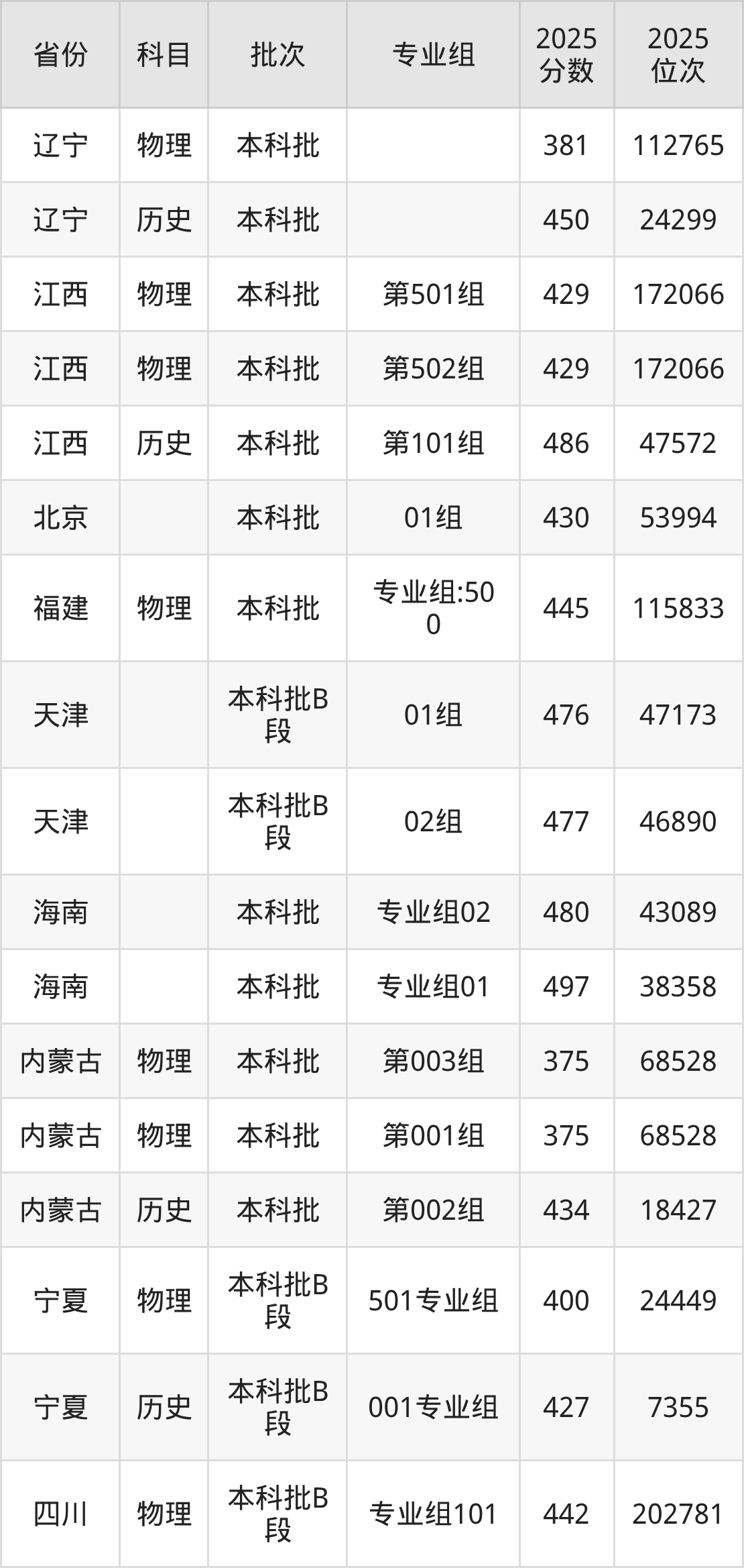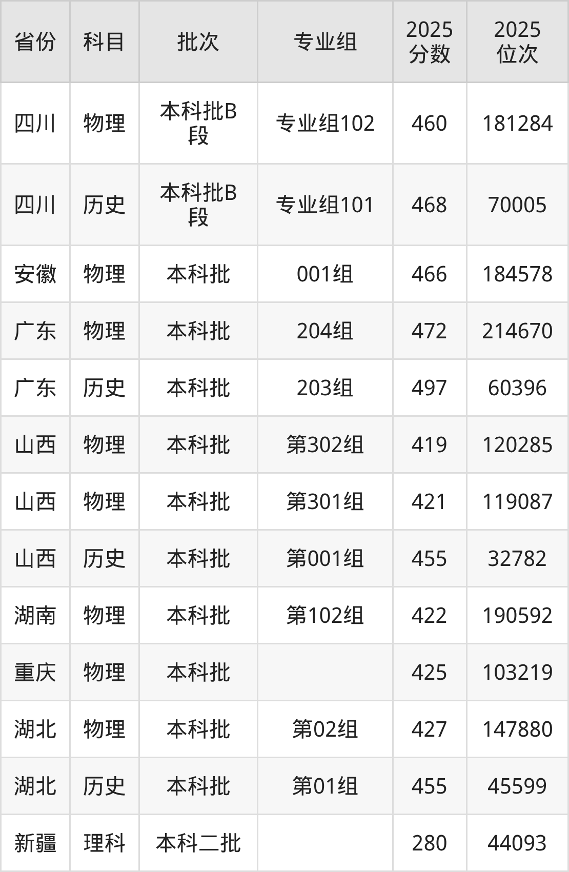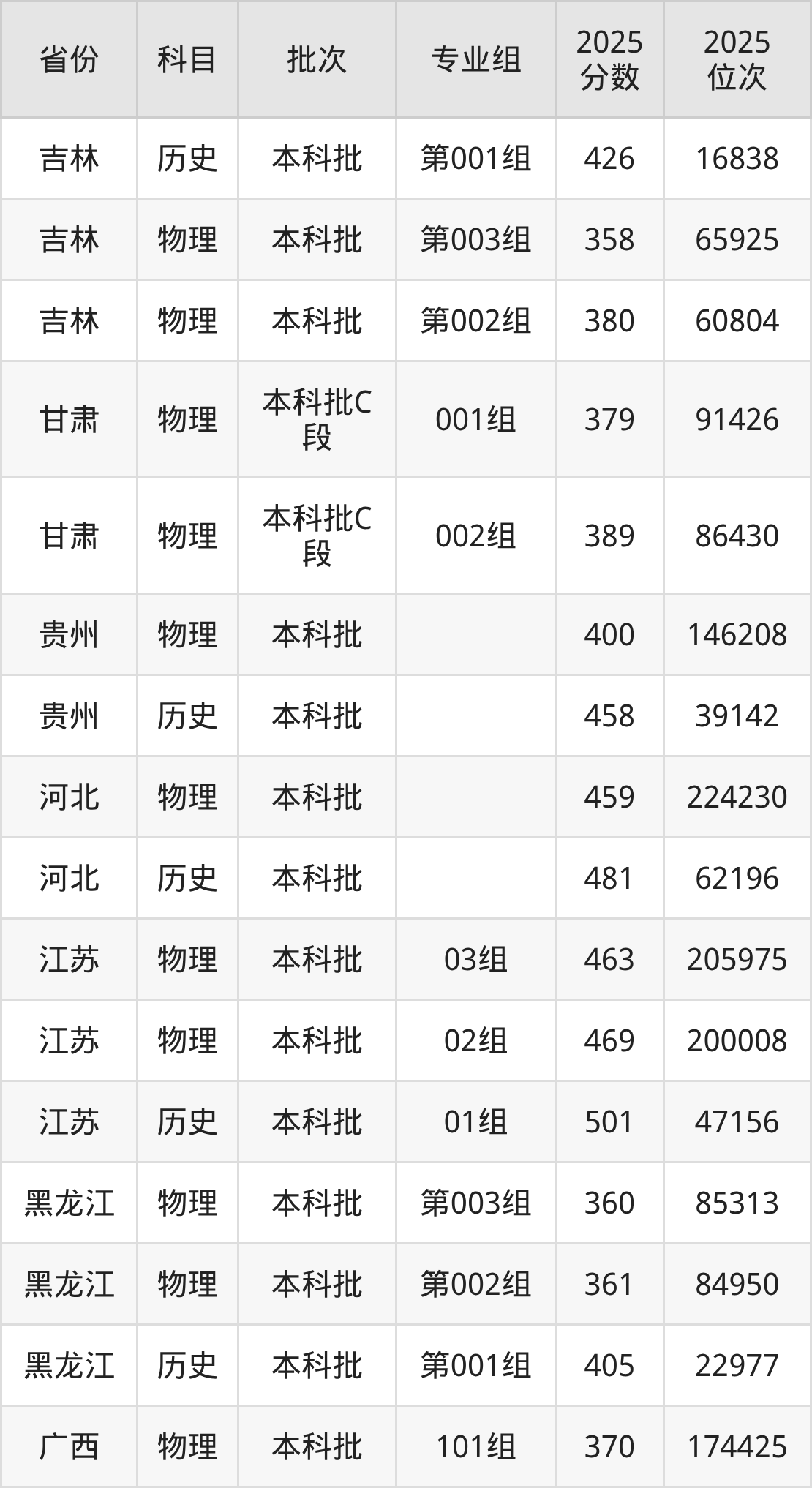 2025年在本科物理类进行招生,各专业组分数线详情如下: