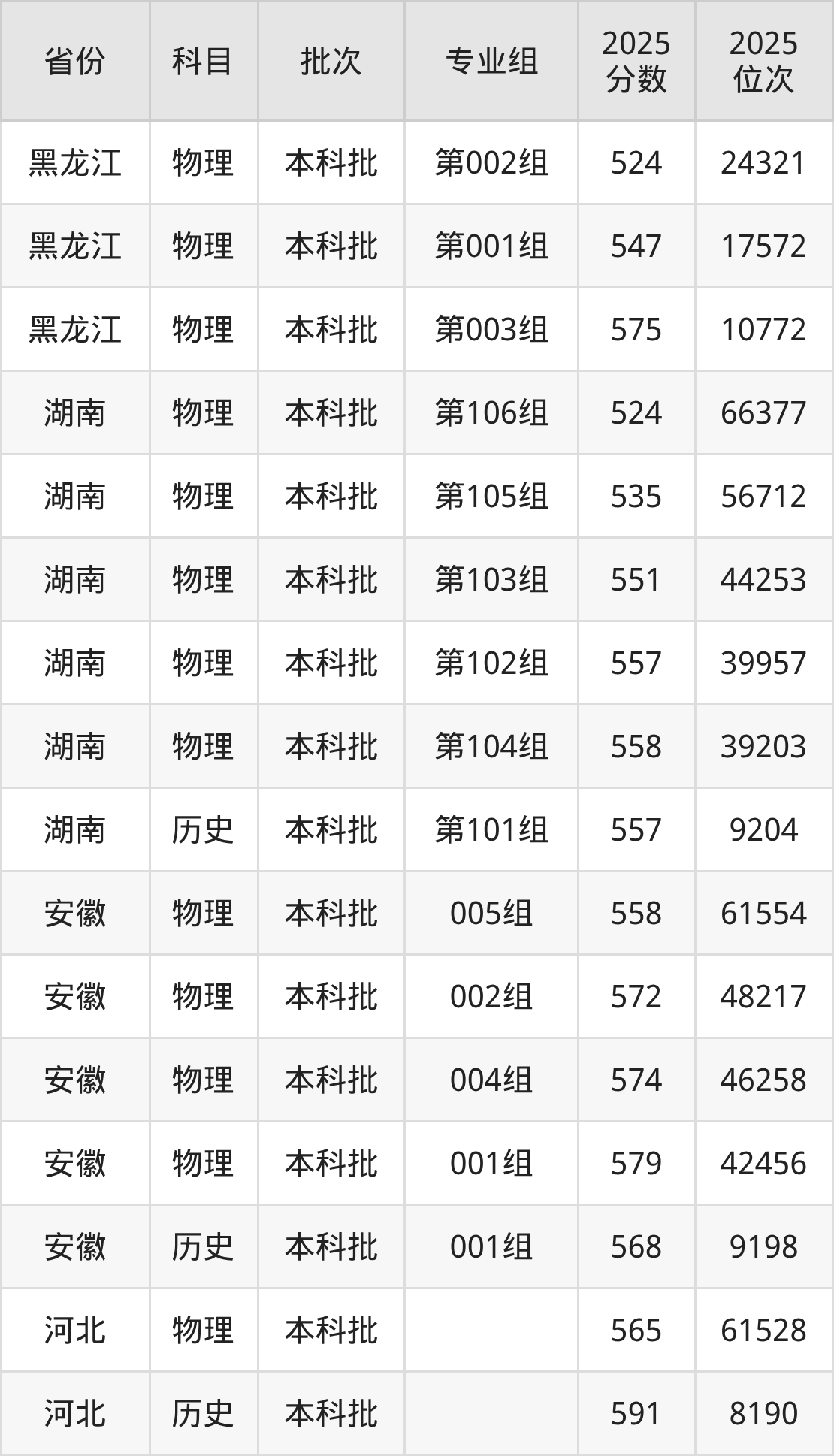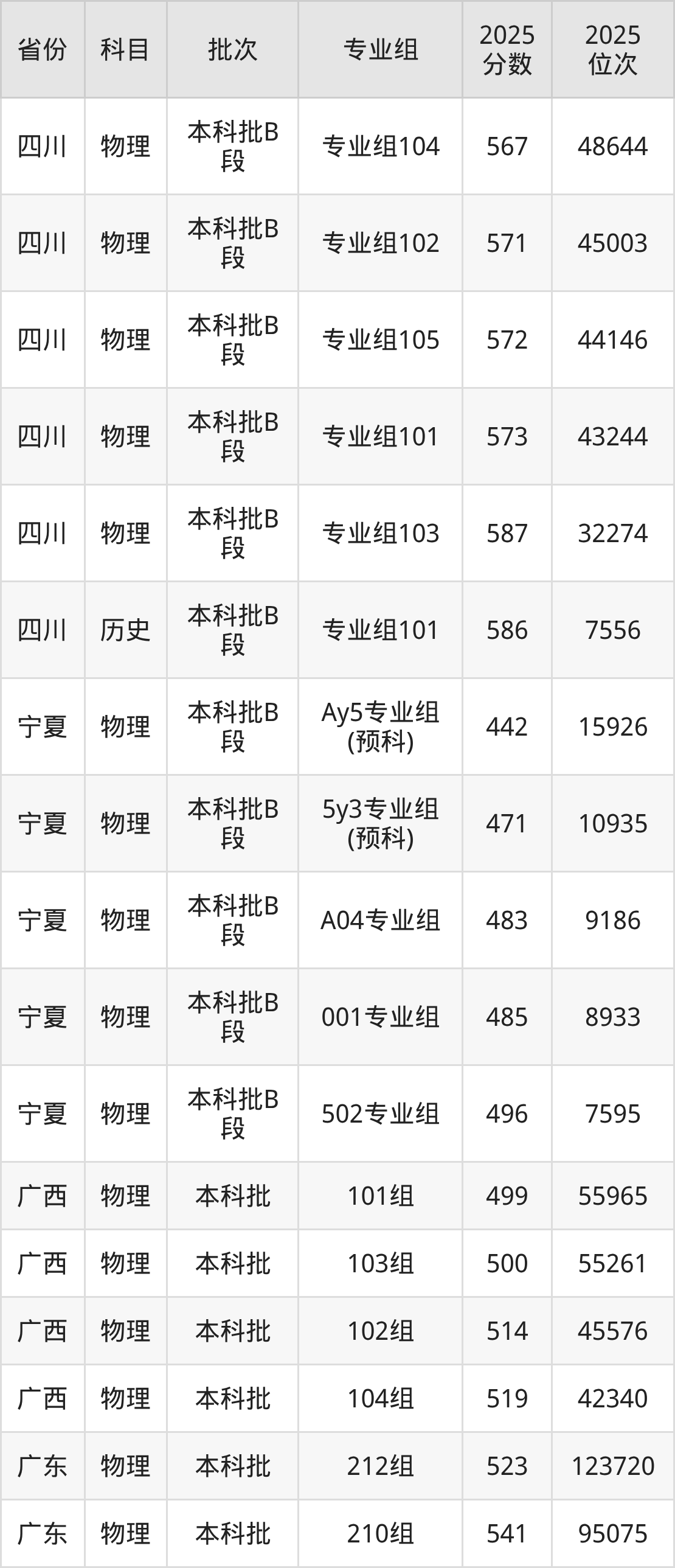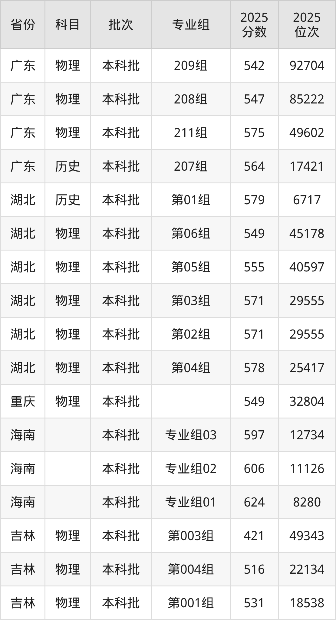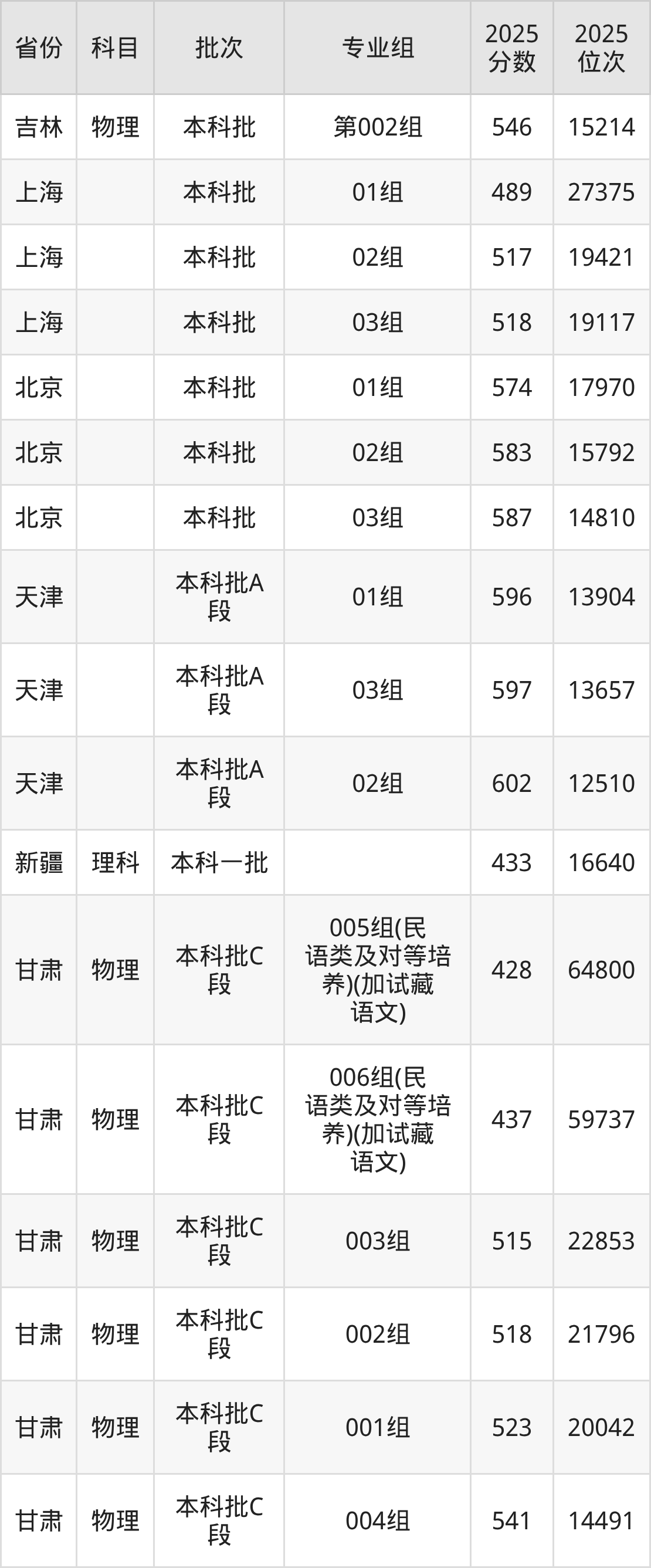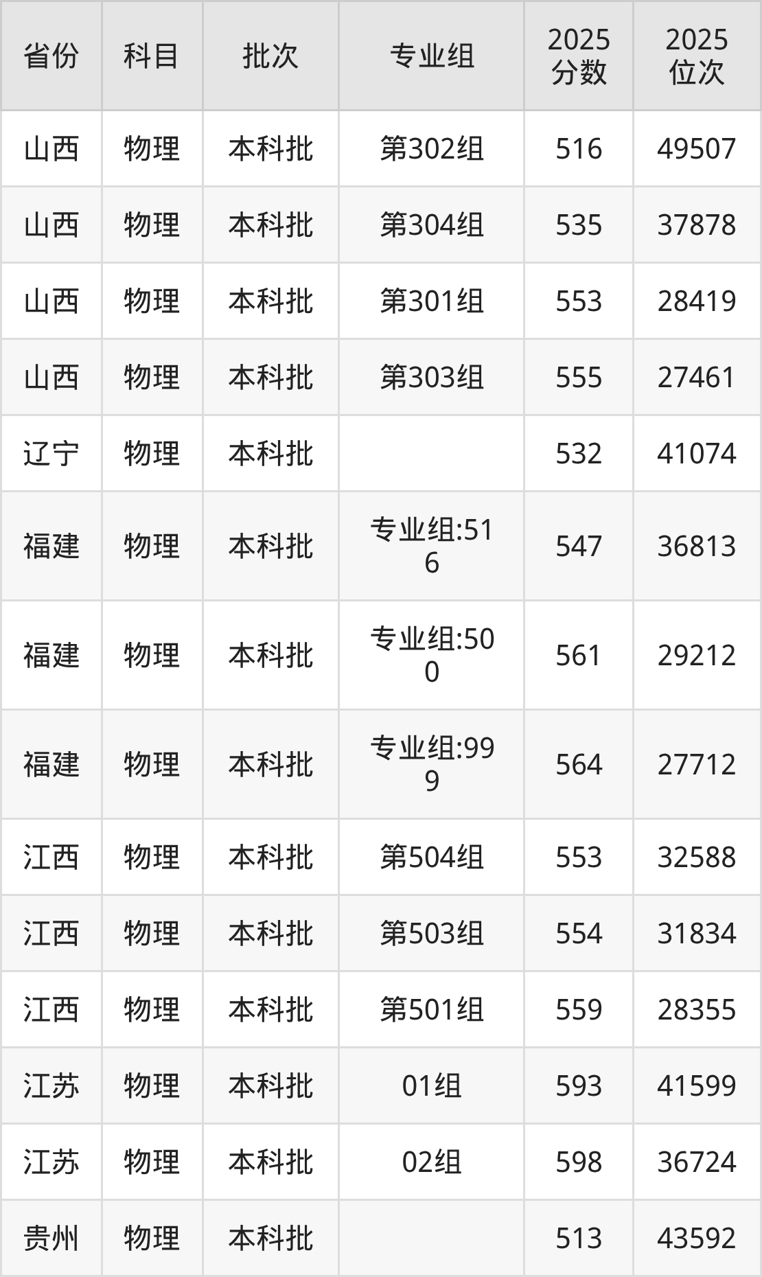 2025年在本科物理类进行招生,各专业组分数线详情如下: