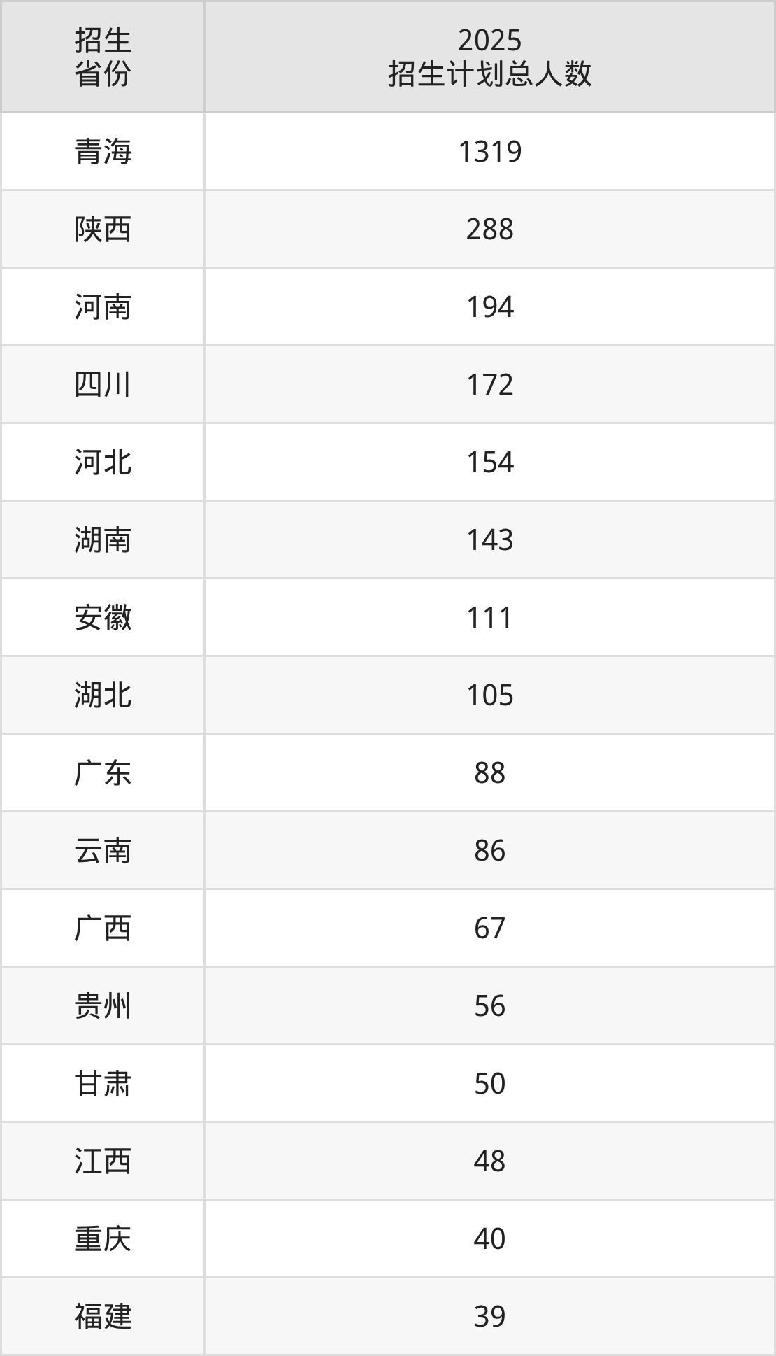 2025年青海大学面向全国27个省市开展本科招生;招生专业共58个,招生人数共3125人。2025年在青海省招生计划总人数是1319人,其中,青海大学在青海省招生人数最多的是临床医学。青海大学在各省具体招生人数情况如下表。