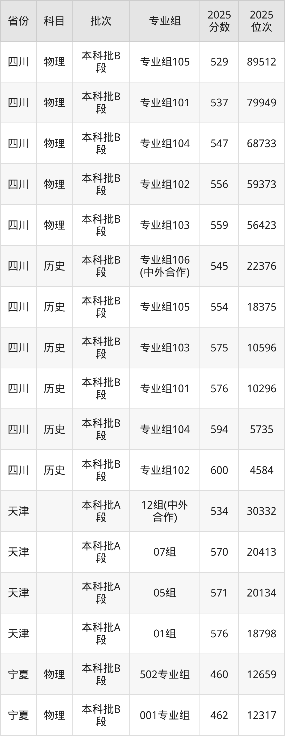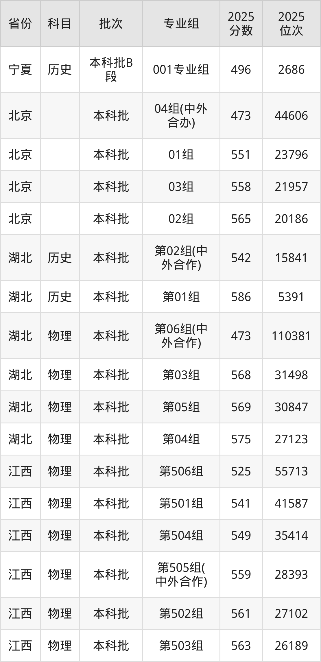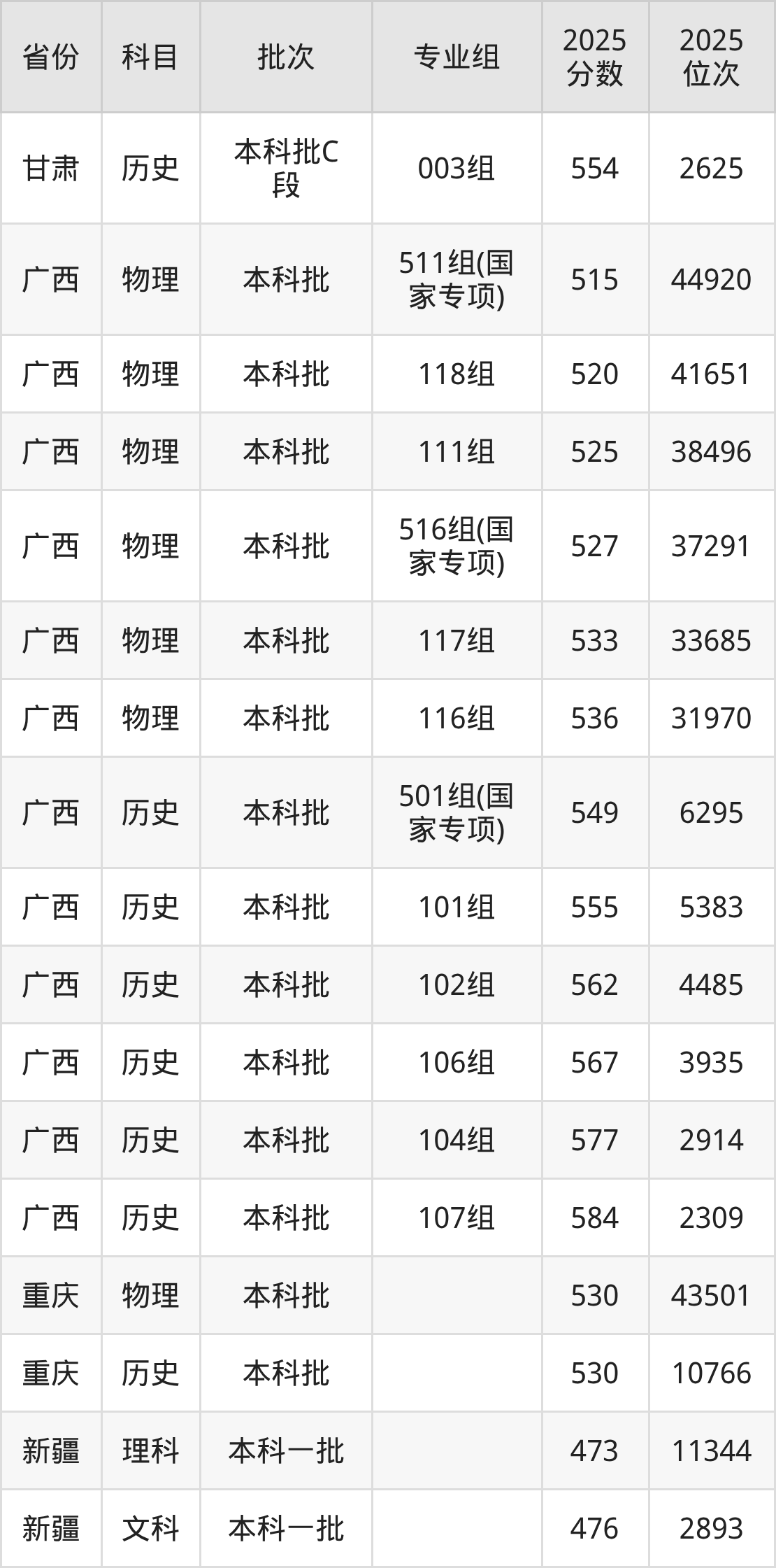 2025年在本科物理类进行招生,各专业组分数线详情如下: