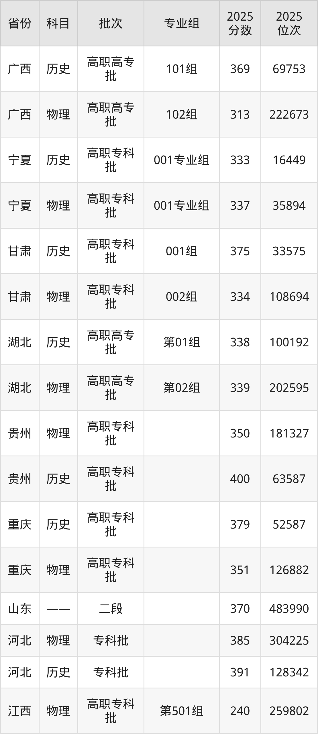 普通类专科历史类最低375分,专科物理类最低334分
