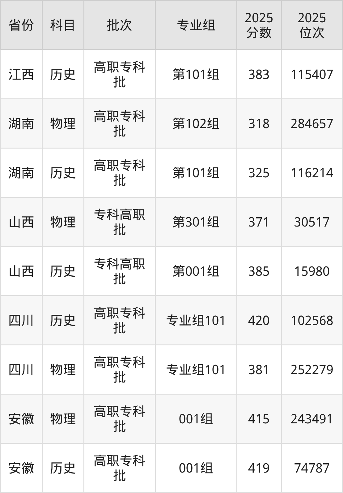 普通类专科物理类最低240分,专科历史类最低383分