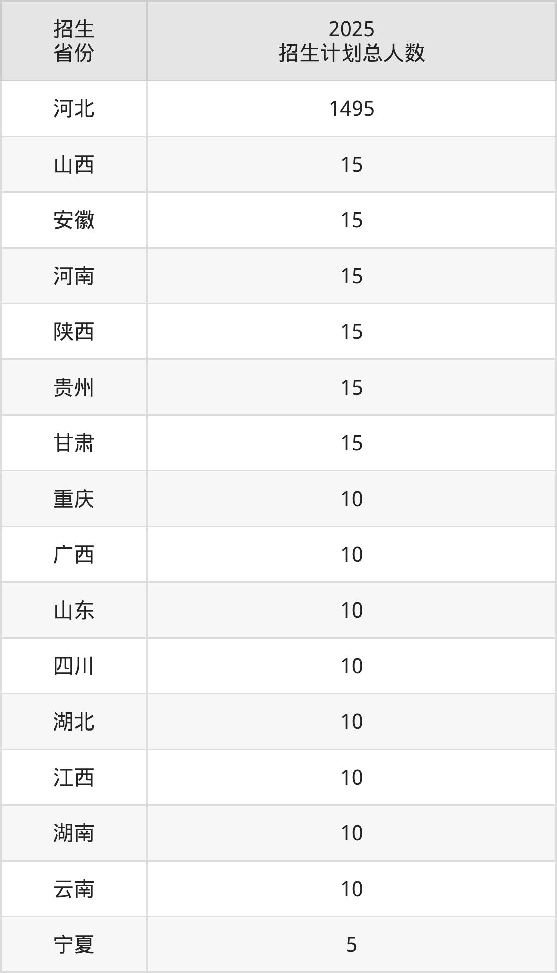 2025年邯郸幼儿师范高等专科学校面向全国16个省市开展专科招生;招生专业共13个,招生人数共1670人。2025年在河北省招生计划总人数是1495人,其中,邯郸幼儿师范高等专科学校在河北省招生人数最多的是小学语文教育。邯郸幼儿师范高等专科学校在各省具体招生人数情况如下表。