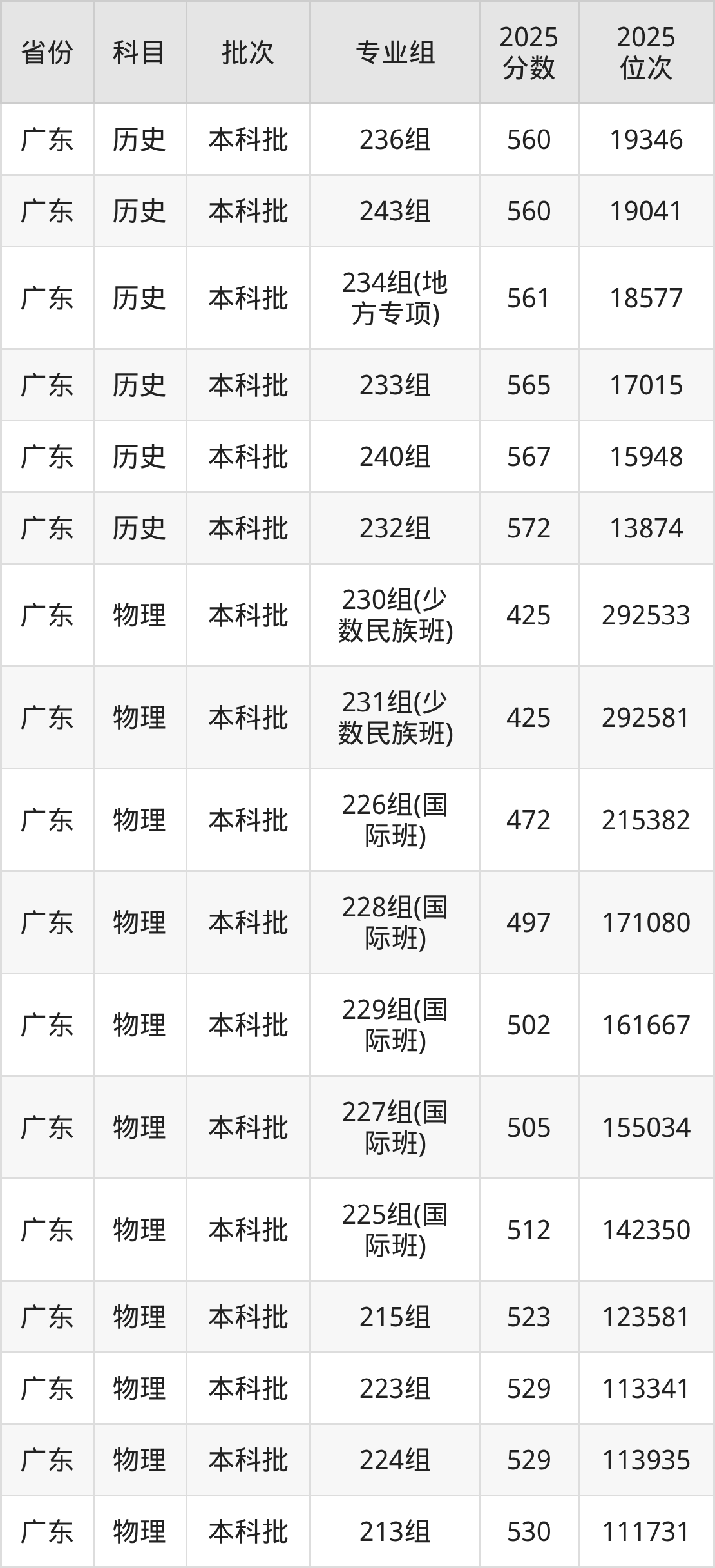 广东技术师范大学230组(少数民族班):2025年投档录取最低分为425分,录取最低位次为292533名。