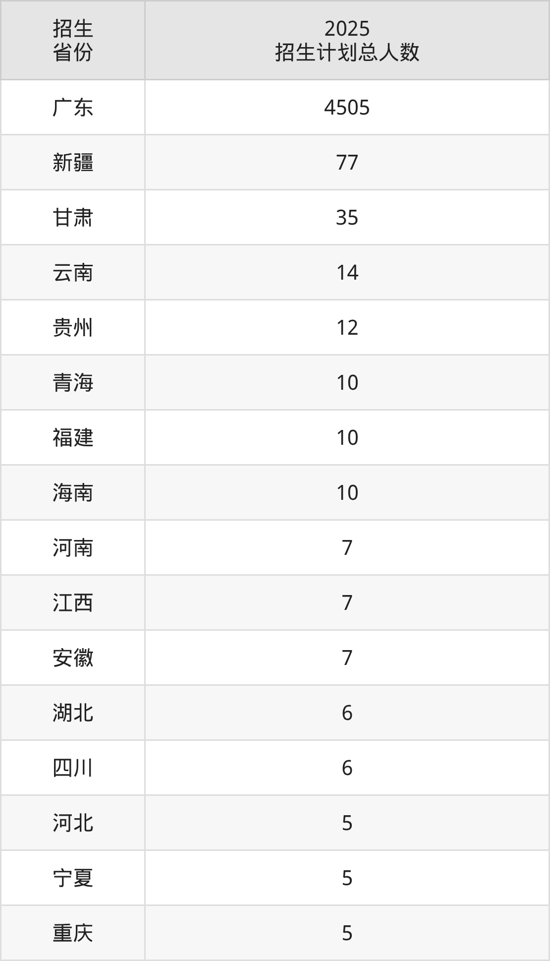 2025年广东技术师范大学面向全国21个省市开展本科招生;招生专业共52个,招生人数共4740人。2025年在广东省招生计划总人数是4505人,其中,广东技术师范大学在广东省招生人数最多的是数学与应用数学。广东技术师范大学在各省具体招生人数情况如下表。