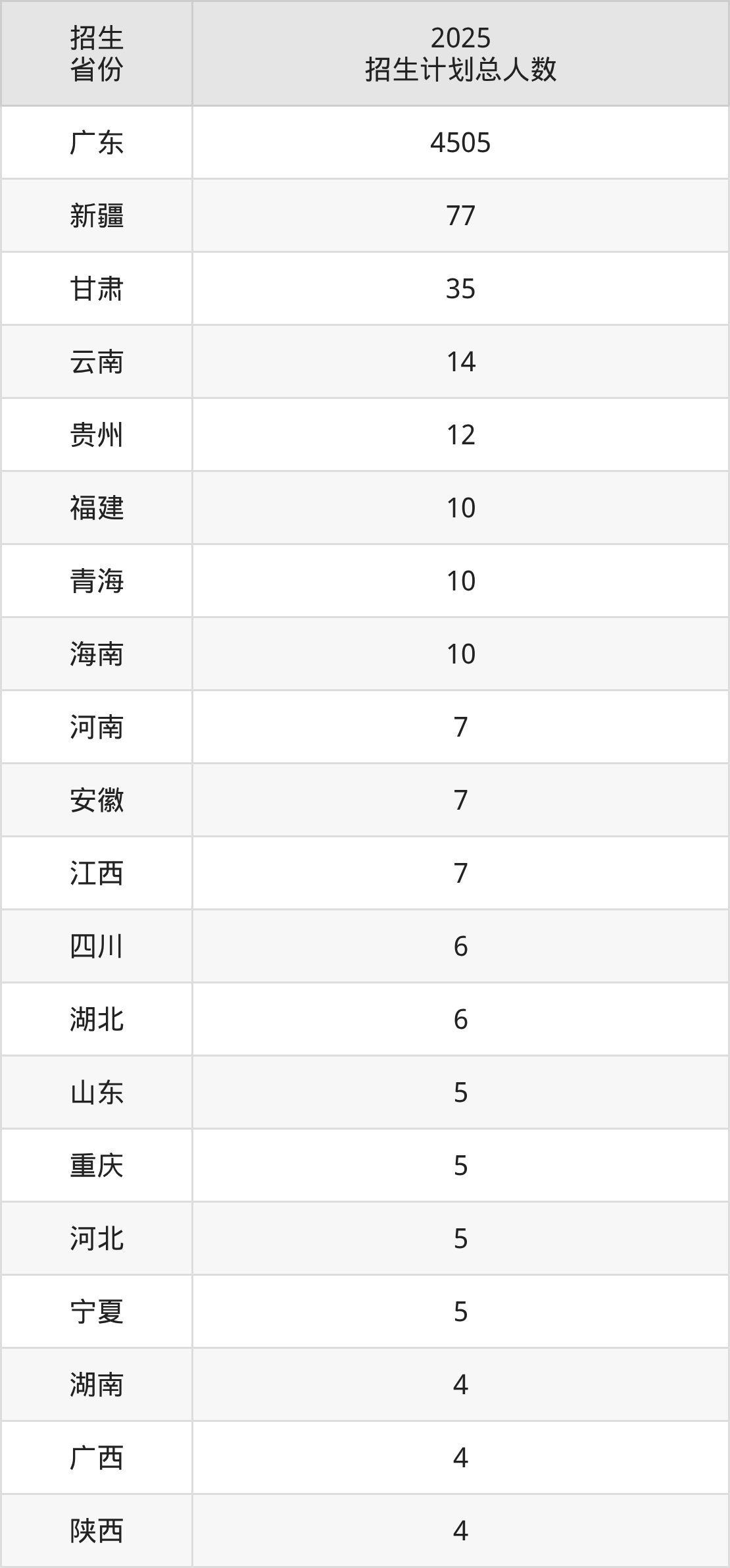 2025年广东技术师范大学面向全国22个省市开展本科招生;招生专业共52个,招生人数共4745人。2025年在广东省招生计划总人数是4505人,其中,广东技术师范大学在广东省招生人数最多的是数学与应用数学。广东技术师范大学在各省具体招生人数情况如下表。