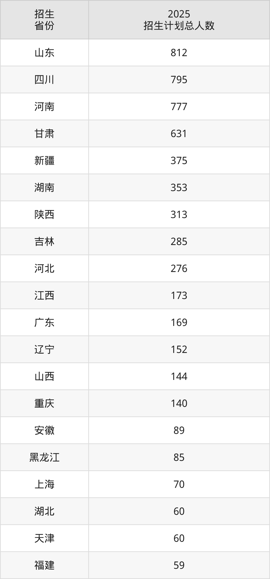 2025年喀什大学面向全国29个省市开展本科招生;招生专业共61个,招生人数共6063人。2025年在新疆维吾尔自治区招生计划总人数是375人,其中,喀什大学在新疆维吾尔自治区招生人数最多的是中国少数民族语言文学。喀什大学在各省具体招生人数情况如下表。