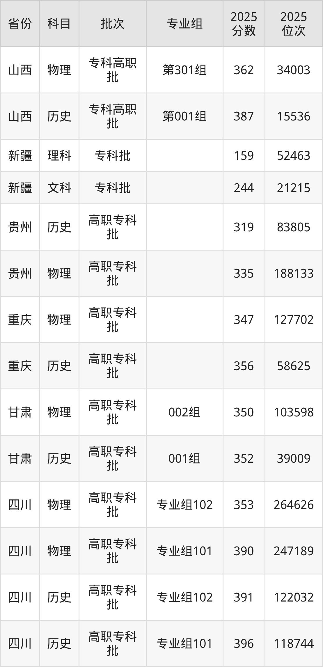 2025年重庆安全技术职业学院全国录取分数线是159分到396分,录取最低在新疆理科、录取最高在四川历史类(专业组101)。各省各专业组最低分具有差异,详情如下: