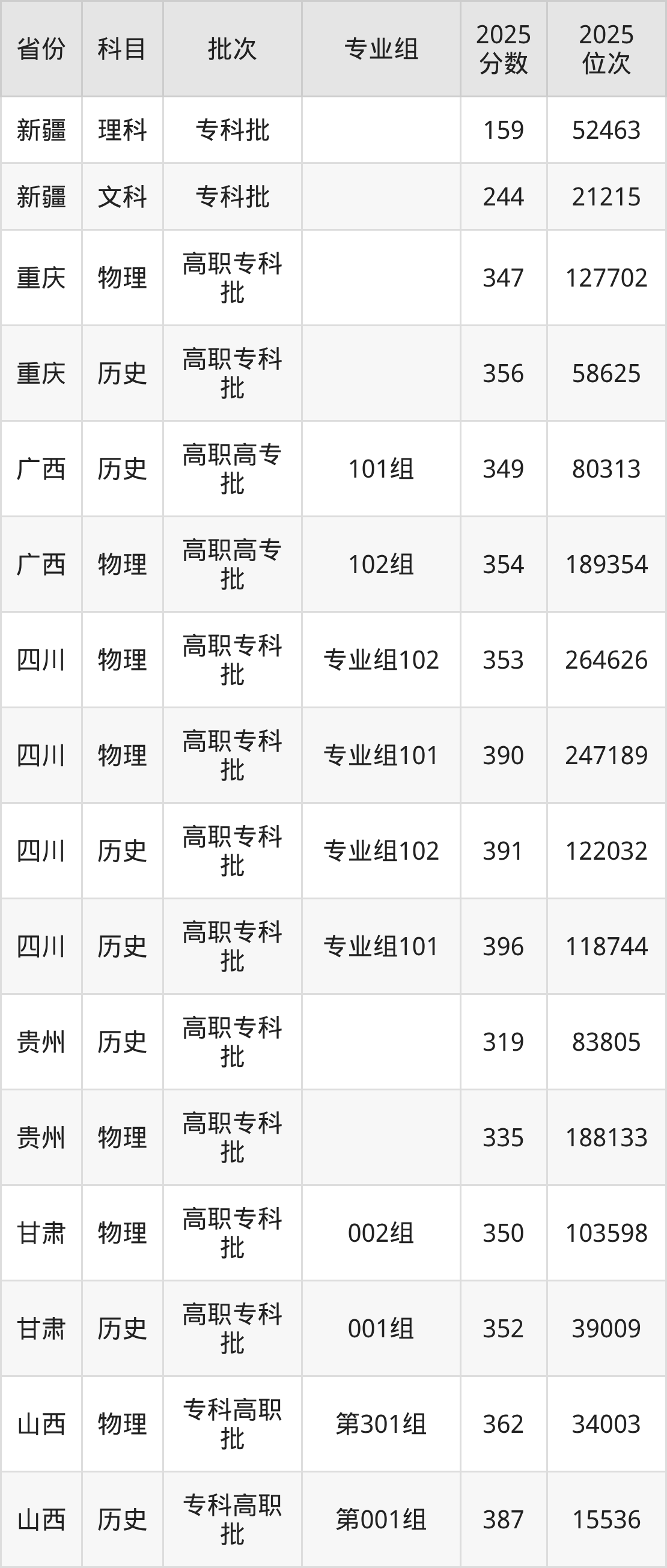 2025年重庆安全技术职业学院全国录取分数线是159分到410分,录取最低在新疆理科、录取最高在重庆历史类。各省各专业组最低分具有差异,详情如下: