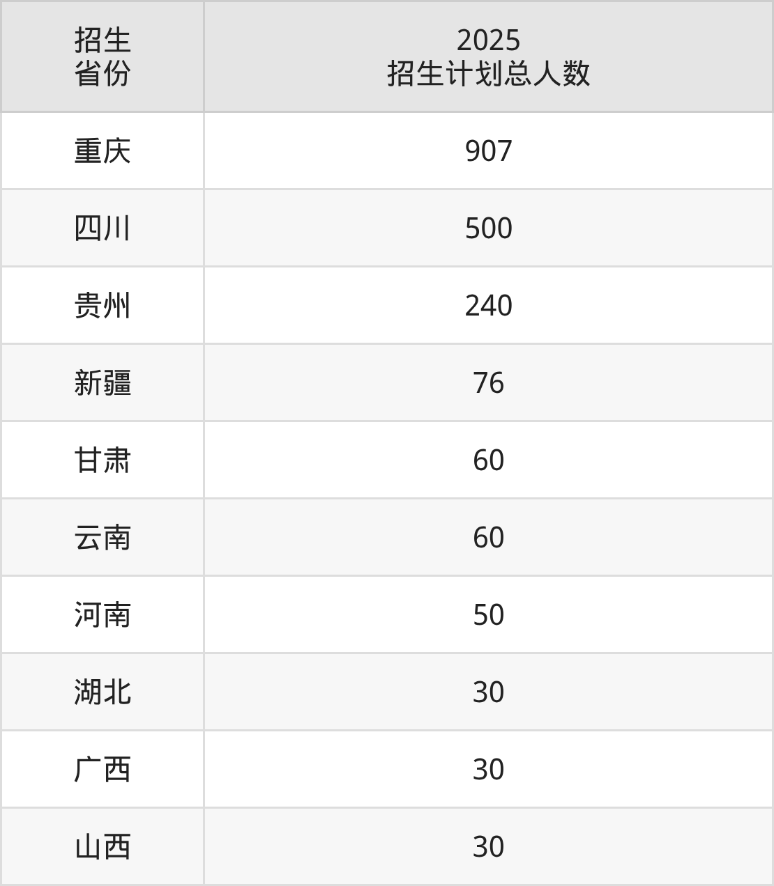 2025年重庆安全技术职业学院面向全国10个省市开展专科招生;招生专业共29个,招生人数共1983人。