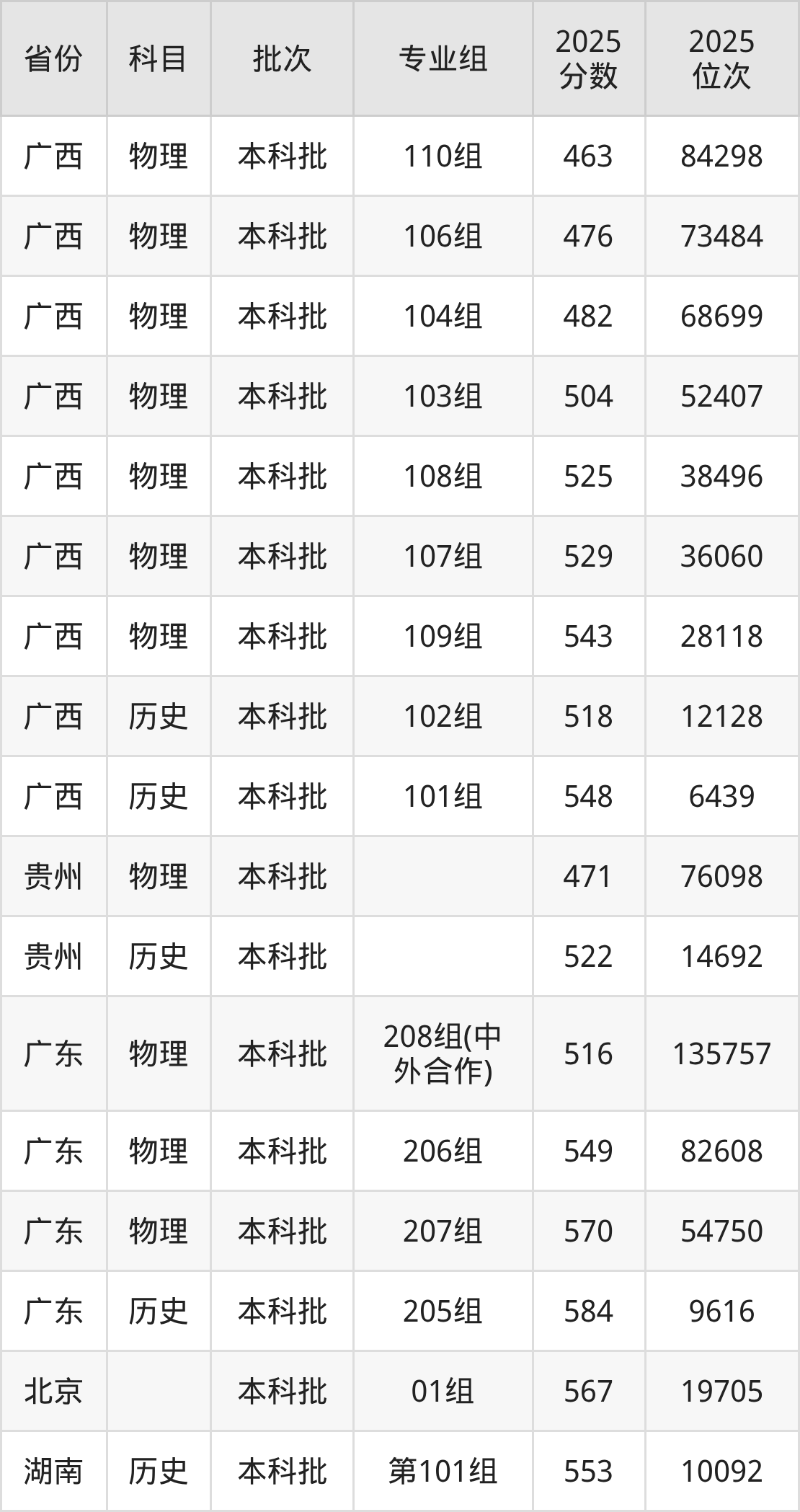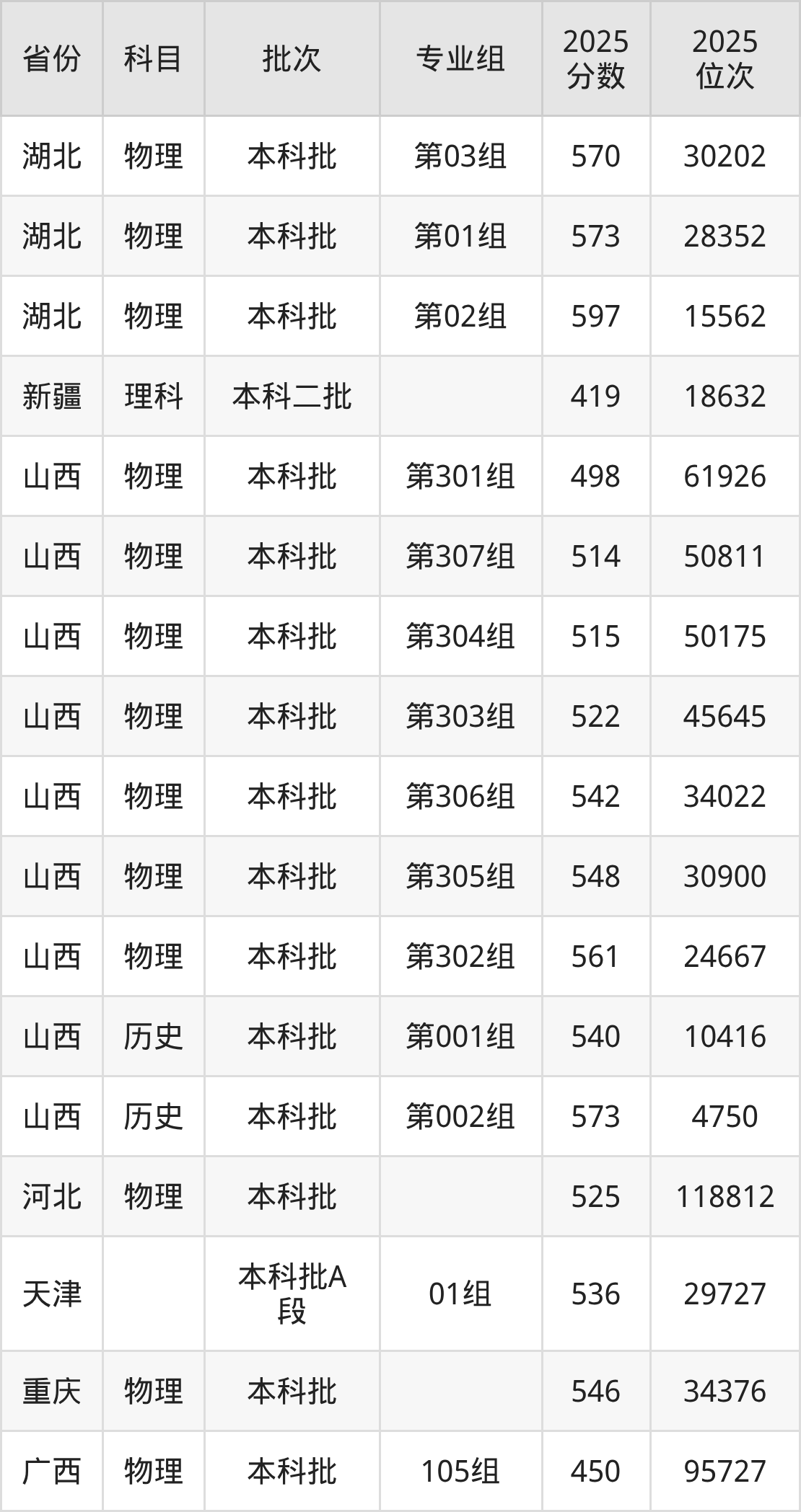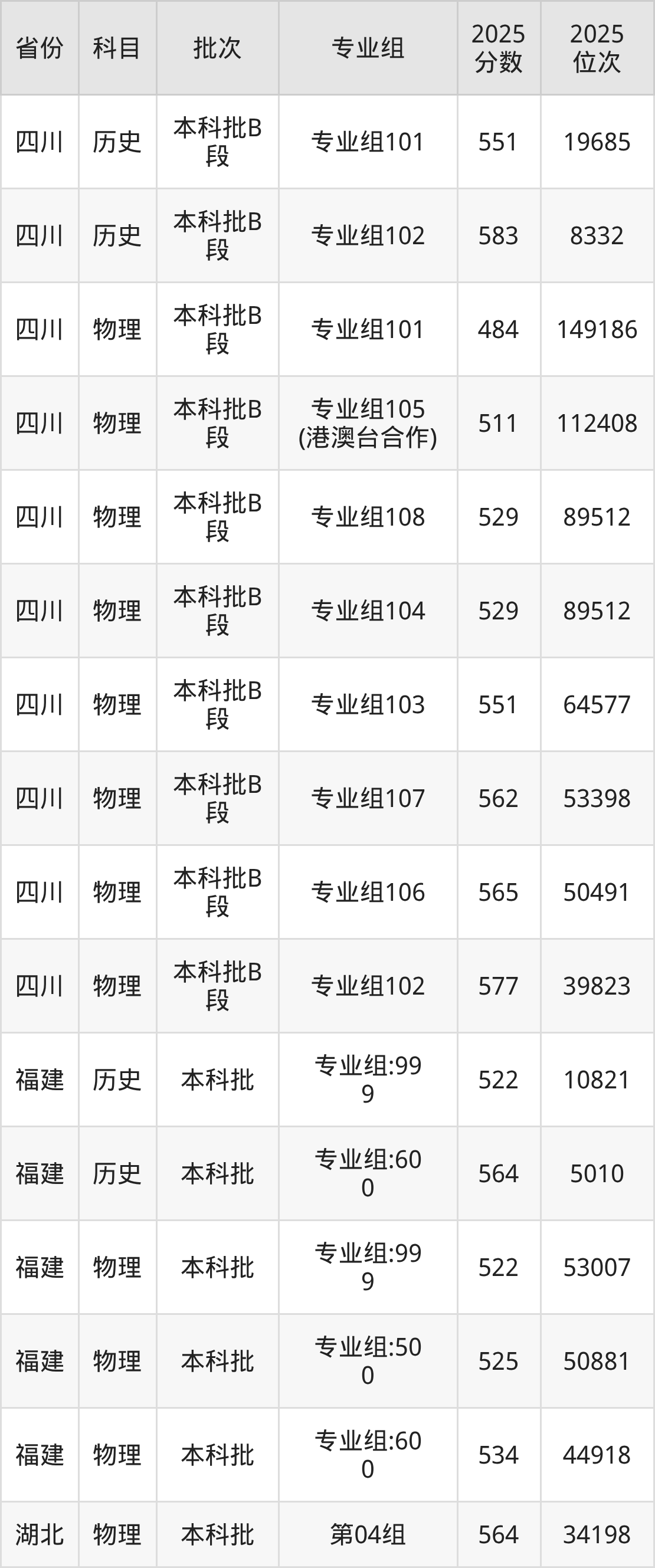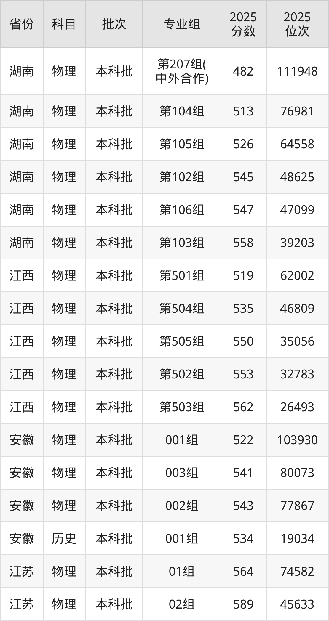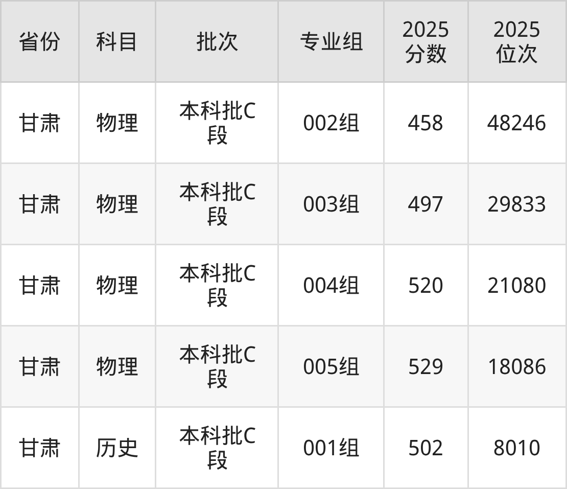 2025年在本科物理类进行招生,各专业组分数线详情如下: