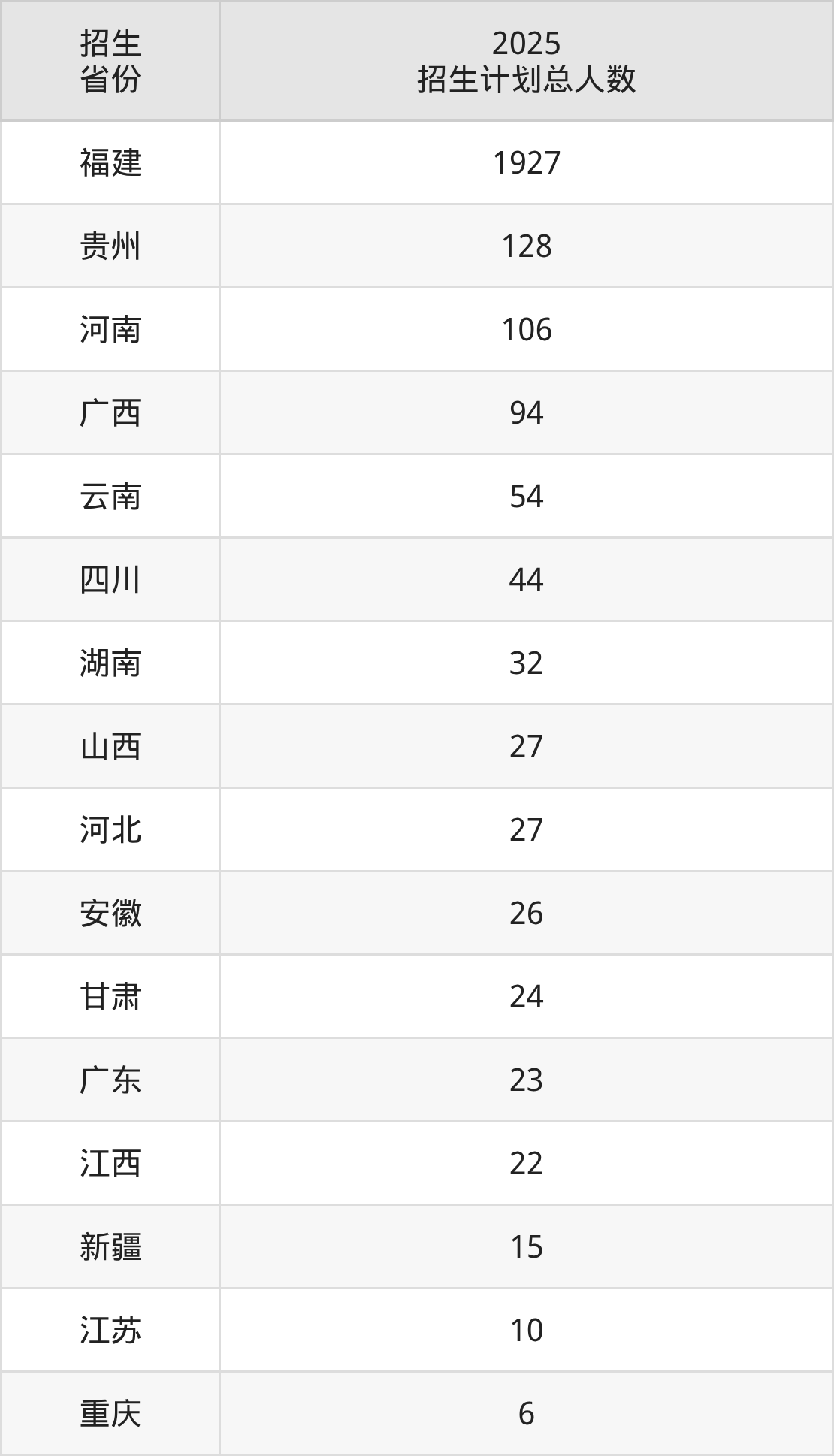 2025年福建中医药大学面向全国19个省市开展本科招生;招生专业共17个,招生人数共2574人。2025年在福建省招生计划总人数是1927人,其中,福建中医药大学在福建省招生人数最多的是临床医学。福建中医药大学在各省具体招生人数情况如下表。