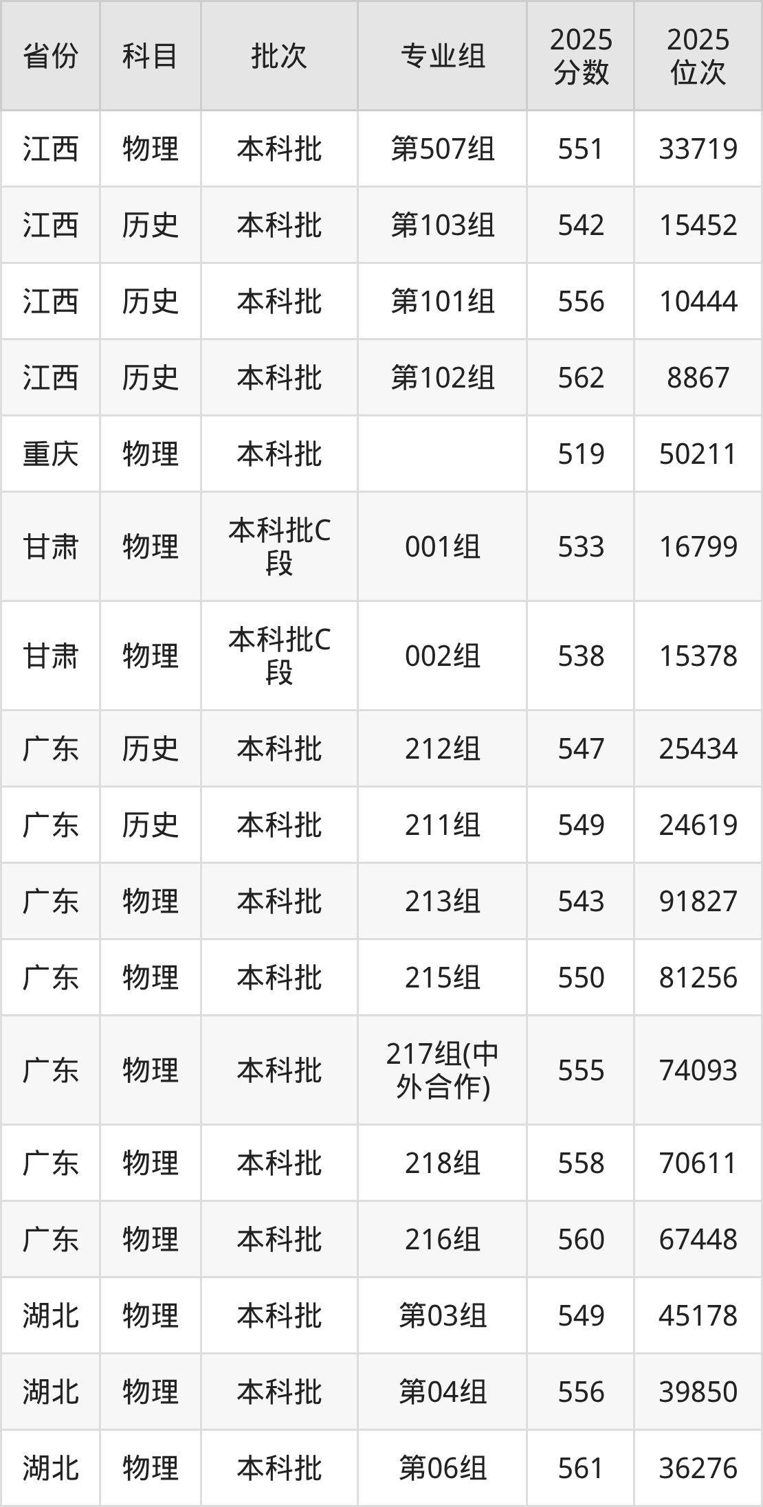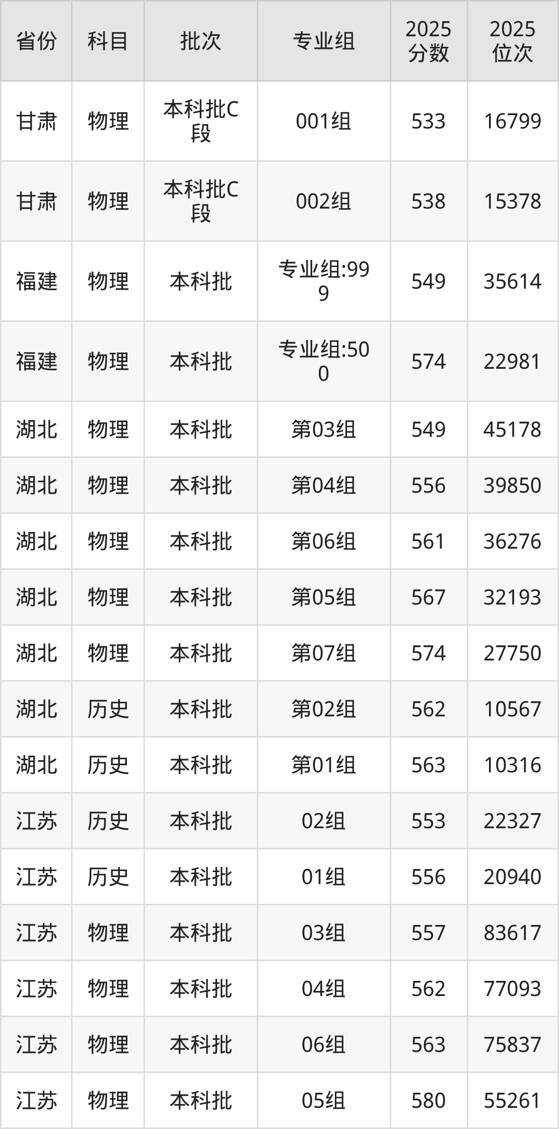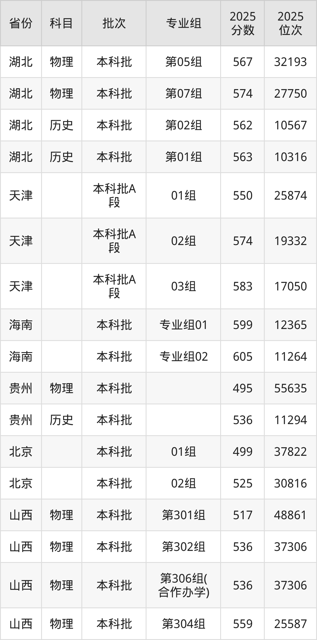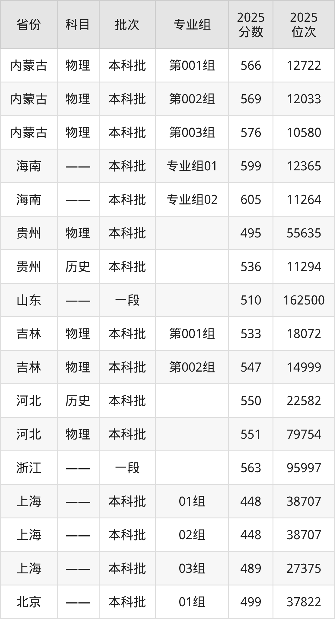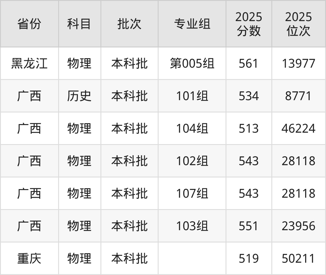 2025年在本科物理类进行招生,各专业组分数线详情如下: