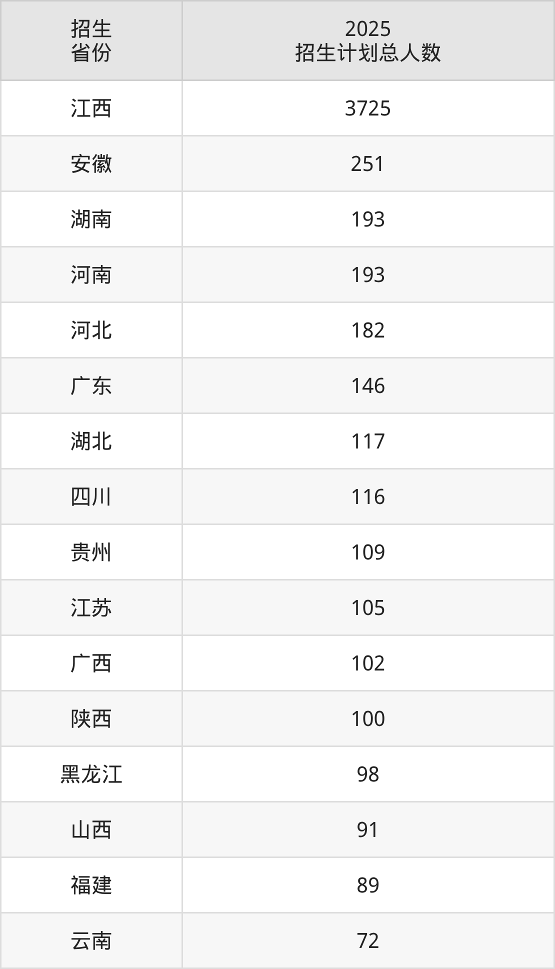 2025年南昌航空大学面向全国26个省市开展本科招生;招生专业共51个,招生人数共6071人。2025年在江西省招生计划总人数是3725人,其中,南昌航空大学在江西省招生人数最多的是软件工程。南昌航空大学在各省具体招生人数情况如下表。