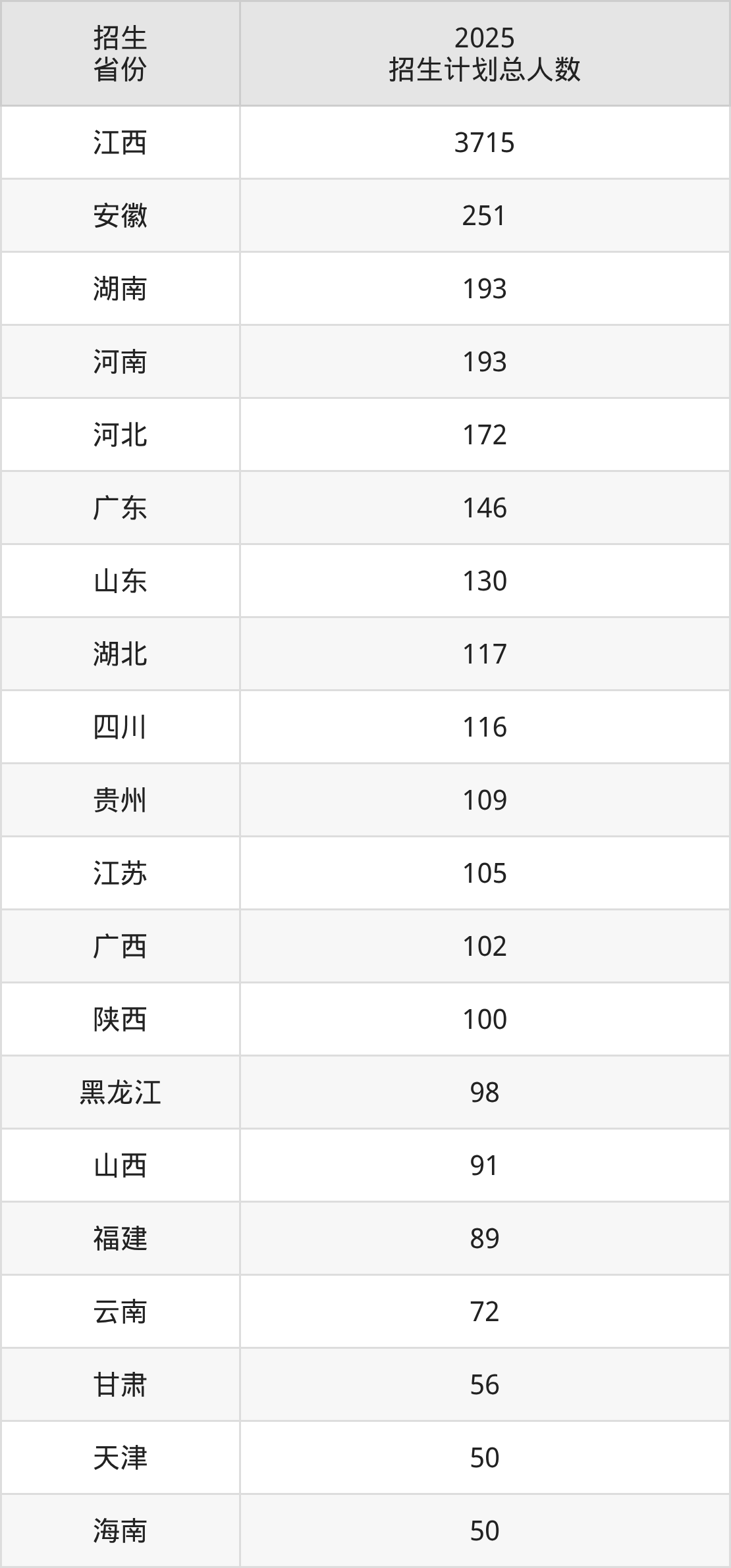 2025年南昌航空大学面向全国27个省市开展本科招生;招生专业共50个,招生人数共6181人。2025年在江西省招生计划总人数是3715人,其中,南昌航空大学在江西省招生人数最多的是软件工程。南昌航空大学在各省具体招生人数情况如下表。